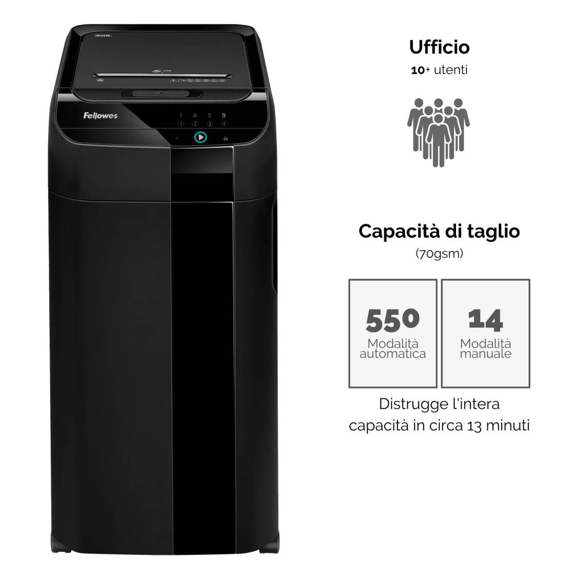 Distruggidocumenti taglio a frammento (4x38mm) ad alimentazione automatica per ufficio con uso condiviso grazie alla chiusura di sicurezza "Blocco Intelligente™" che blocca il cassetto durante il ciclo di distruzione, proteggendo le informazioni sensibili grazie ad un PIN a 4 cifre. Distruzione automatica fino a 550 fogli premendo il tasto di avvio. Oltre a CD/DVD e carte di credito (dalla fessura manuale), clip e punti metallici, può distruggere senza problemi anche carta spiegazzata, posta indesiderata, fogli stampati a colori su entrambi i lati, fascicoli spillati insieme (non importa dove si trovi il punto metallico) fino ad un massimo di 25 fogli. E' inoltre dotato di fessura per inserimento manuale 230mm (fino a 14 fogli). Velocità di taglio: 3,35MPM. Ciclo di lavoro: 45min on/30off. Capacità cestino 83 litri. Livello Din: P4. Livello DIN carte di credito: T4. Livello DIN CD: O-3. Dimensioni: 89x44,1x57,8cm. Peso 33,6Kg. Spegnimento automatico dopo 2 minuti di inattività. 1 bottiglietta d’olio da 120ml e 3 sacchetti inclusi.
