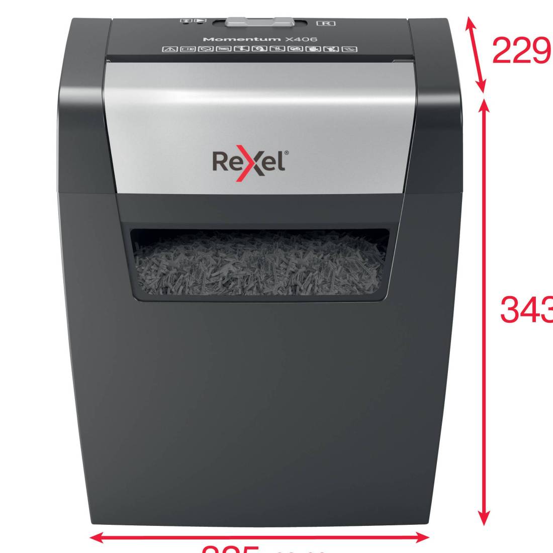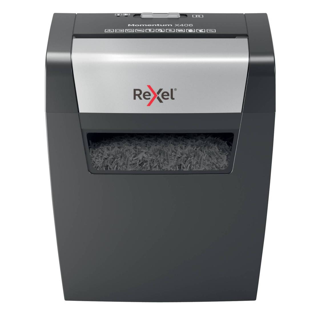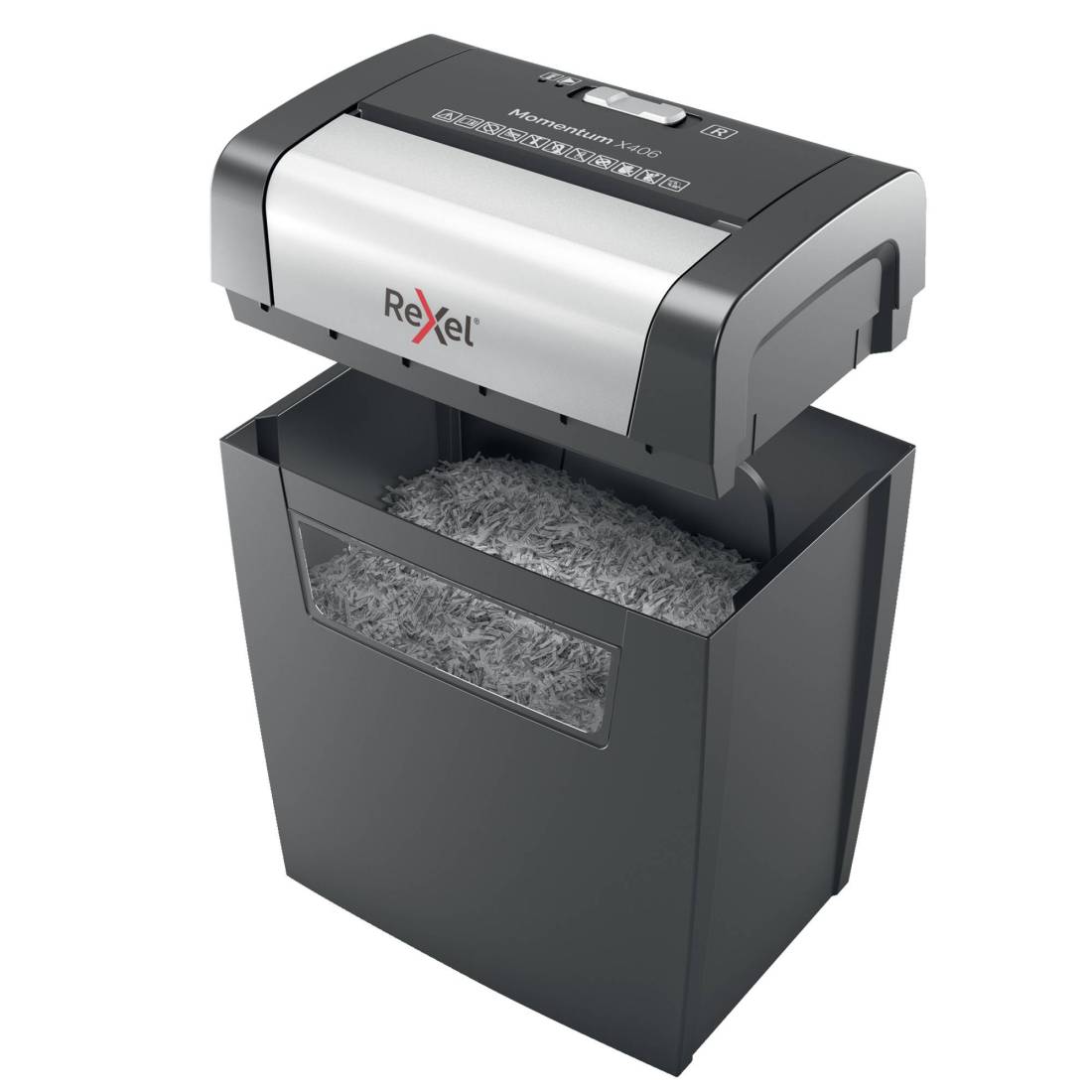 Il potere di distruggere di più! Rexel momentum X406 distrugge fino a 6 fogli per volta con un ciclo di lavoro continuo di 3 minuti che lo rende ideale per l'uso a casa. Livello di sicurezza P4 con taglio a frammenti da 4x30 mm. Capacità del cestino da 15 litri (125 fogli A4) Distrugge fino a 6 fogli per volta Alto livello di sicurezza P4 con taglio a frammenti da 4x30 mm Distrugge più carta più a lungo con un ciclo di lavorazione continuo di 3 minuti Distrugge facilmente più documenti anche con punti e graffette agli angoli Un generoso cestino da 15L che contiene fino a 125 fogli A4 2 anni di garanzia