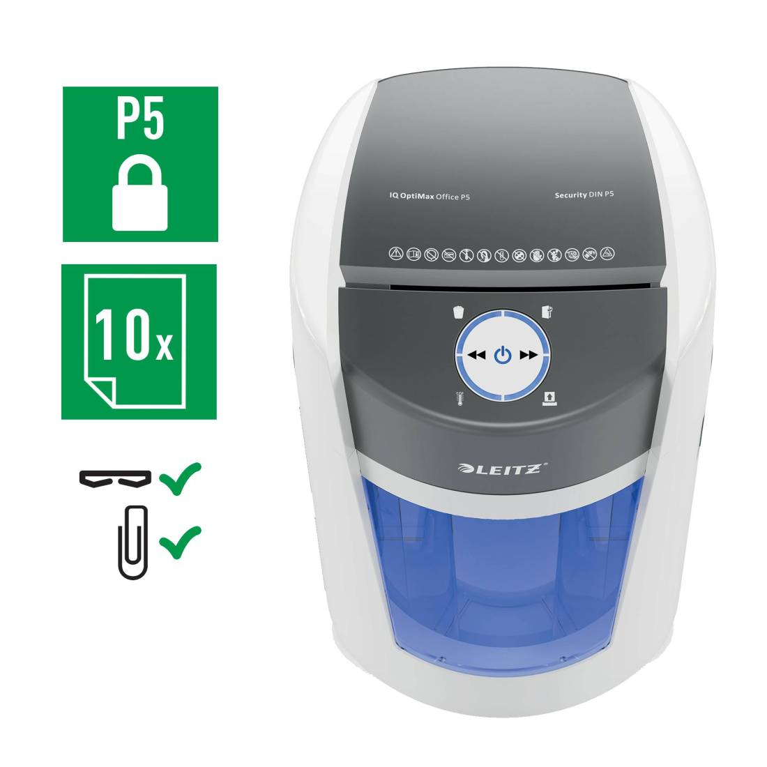 Il distruggidocumenti per ufficio Leitz IQ OptiMax offre una soluzione innovativa ed elegante, garantendo al contempo un'eccezionale sicurezza e tranquillità dei documenti. Questo distruggidocumenti DIN P5 ad alta sicurezza distrugge senza sforzo fino a 10 fogli A4 alla volta in micro frammenti. Dotato di una tecnologia di rotazione del cestino (BRT), che massimizza efficacemente la capacità del 33% in più. Il cestino rotante assicura una distribuzione piatta e uniforme della carta per evitare che i frammenti formino un effetto piramide nel cestino, consentendo di distruggere altri 140 fogli A4 prima di doverlo svuotare. La tecnologia del cestino rotante permette di non rimuovere o scuotere il contenitore; l'indicatore di "cestino pieno" si attiva solo quando raggiunge il 100% della capacità. Il generoso cestino da 35 litri può contenere fino a 550 fogli A4 e si illumina di blu durante l'uso per un'esperienza di distruzione ottimale. L'intuitivo display rotante a LED include indicazioni di avvertimento rosse per vari stati, come il cestino pieno e lo sportello aperto. Leitz IQ OptiMax è versatile per qualsiasi ambiente di lavoro grazie al suo funzionamento ultra-silenzioso, al design elegante e alla notevole durata. Autonomia continua di 120 minuti. Colore bianco. Leitz IQ OptiMax testato con e senza tecnologia di rotazione del cestino.Dimensioni 38 x 71 x 38cm. Dimensioni microframmento:2x15.