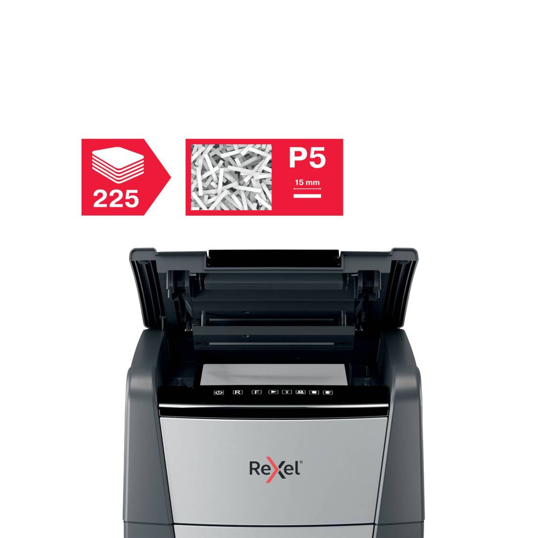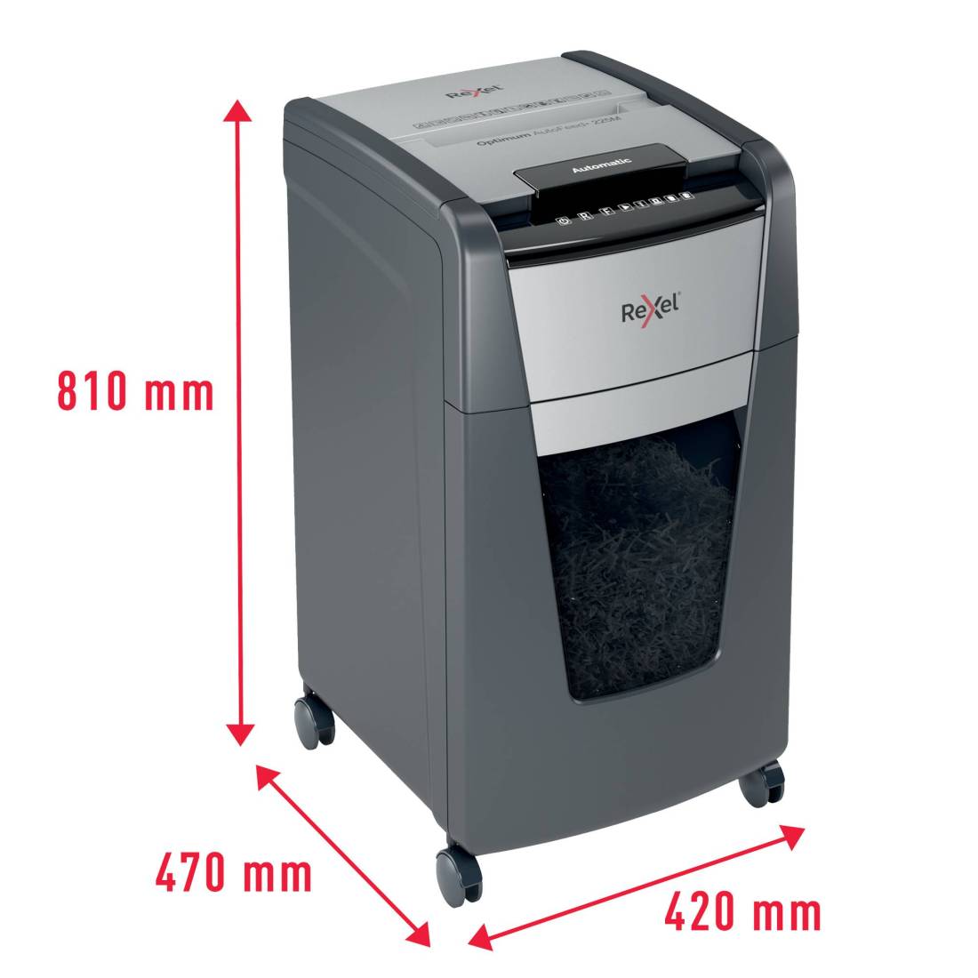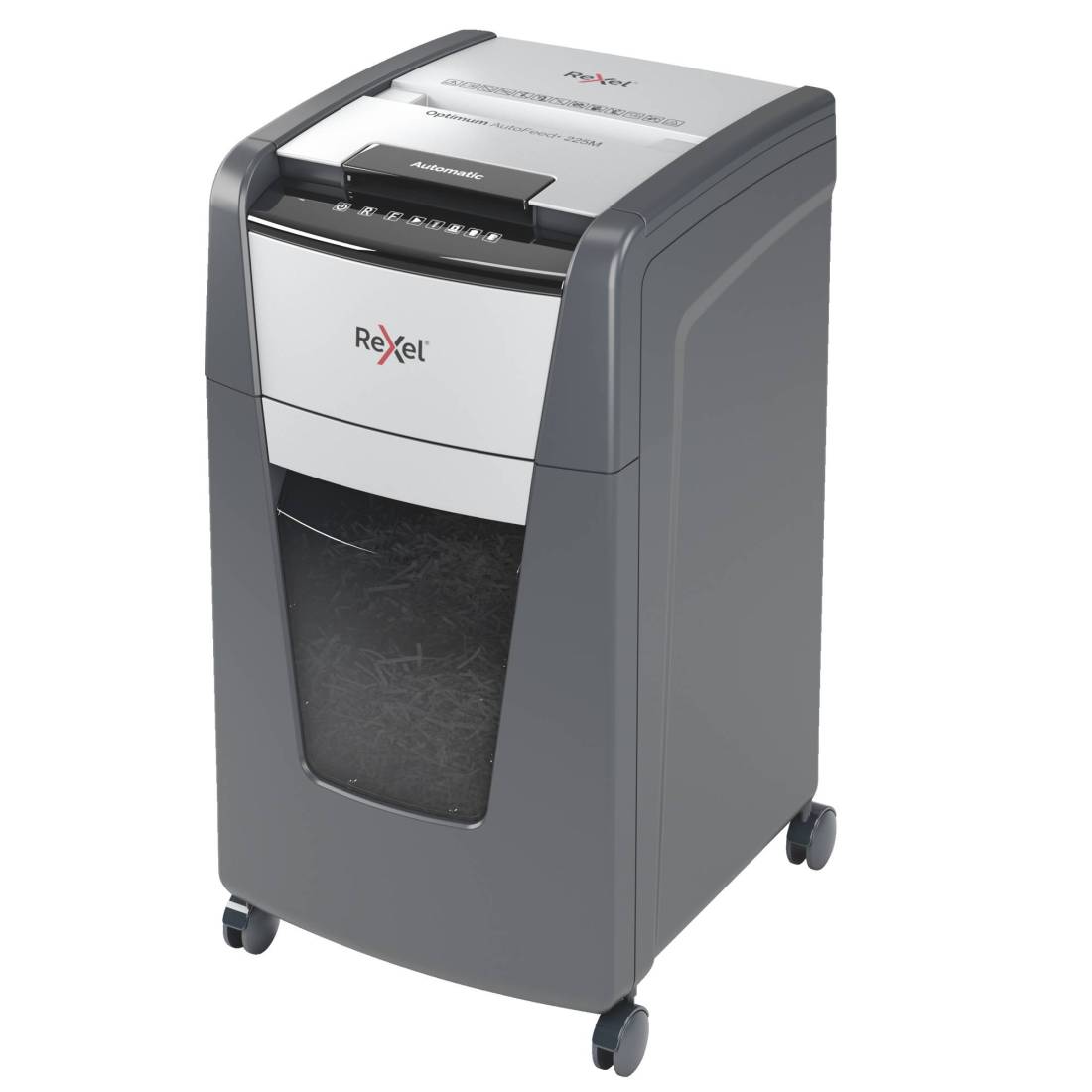Il distruggidocumenti Optimum AutoFeed+ 225M con taglio a frammenti distrugge automaticamente fino a 225 fogli A4 (80 gr/mq) alla volta, con un livello di sicurezza P-5 (2x15mm). Questo distruggidocumenti automatico può essere utilizzato sia a casa sia in ufficio grazie al suo cestino compatto da 60 litri. Non è necessario alimentare manualmente la carta o rimuovere prima i punti e le graffette, questo distruggidocumenti automatico farà tutto il lavoro per te. Tecnologia anti-inceppamento. Ciclo di lavoro continuo per 30 minuti con raffreddamento a ventola. La modalità di risparmio energetico si attiva dopo 3 minuti di inattività. Pannello di controllo touch.