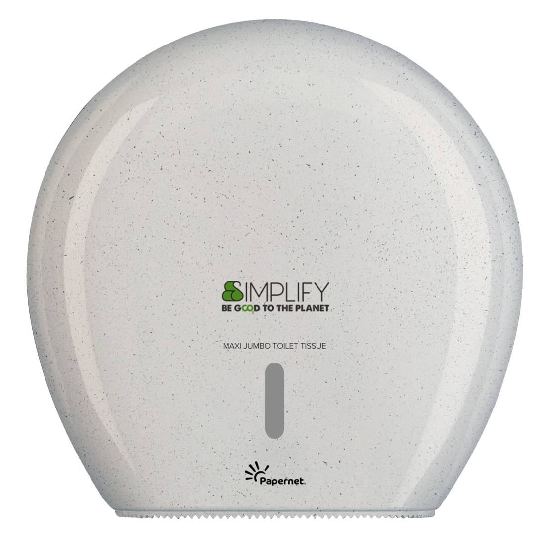 PAPERNETDispenser Simplify per carta igienica Maxi Jumbo (cod. 421333) realizzato per il 75% da materiale plastico post-consumo e materiali in eccesso proveniente dalla lavorazione del legno, al fine di garantire una riduzione degli sprechi nel rispetto dell'ambiente. Dispenser interamente riciclabili. Design pulito ed elegante, realizzato con materiali antiurto per maggiore praticità.