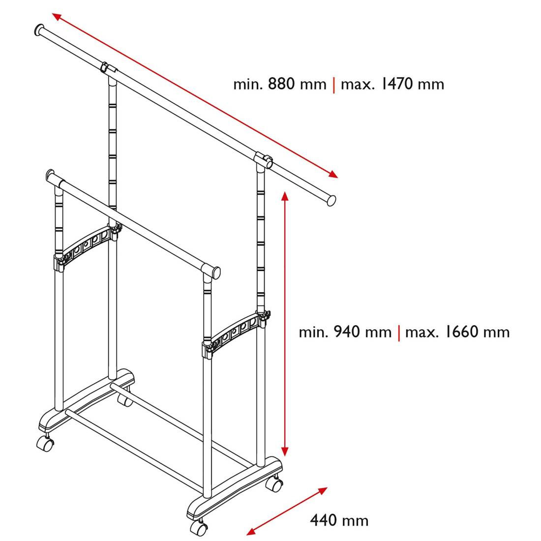 PERFETTOAppendiabiti multiuso facile da trasportare e comodo da usare. Con ampia base di appoggio e tubi estensibili per aumentarne la capacità. Può essere usato come appendiabiti dopo la stiratura, come stendibiancheria per capi ingombranti o in alternativa al classico armadio. Si assembla facilmente senza l'uso di utensili. Dotato di ruote e griglia porta scatole. 2 barre. Misure: base cm 88 estensibile fino a cm 147, altezza cm 94 estensibile fino a cm 166.