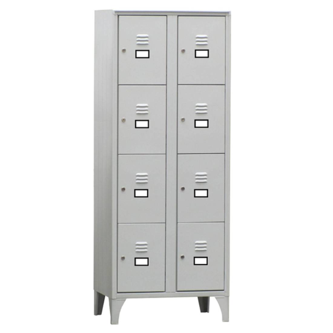 Armadio casellario a 8 vani. Ogni vano ha un ingresso utile di L27 x H37cm ed è dotato di porta cartellino in materiale plastico applicato all’anta. Chiusura con serratura a cilindro con doppia chiave in dotazione. Fornito montato.
