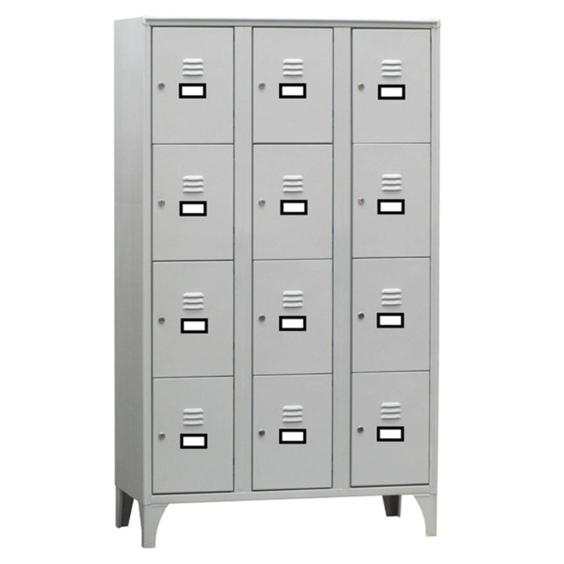 Armadio casellario a 12 vani. Ogni vano ha un ingresso utile di L27 x H37cm ed è dotato di porta cartellino in materiale plastico applicato all’anta. Chiusura con serratura a cilindro con doppia chiave in dotazione. Fornito montato.