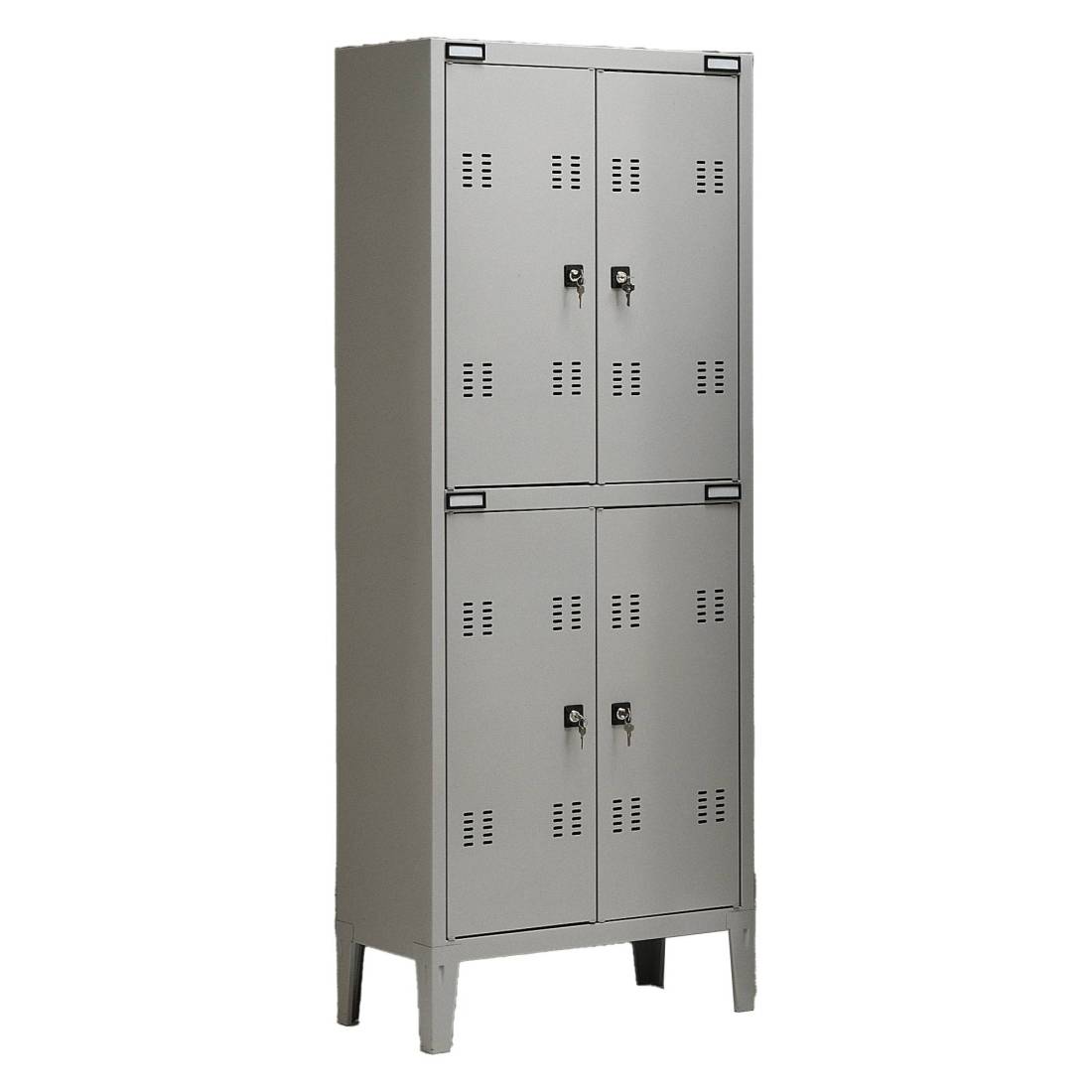 Armadio spogliatoio a 4 posti sovrapposti L70 x P35 x H180cm; in metallo verniciato grigio, provvisto di serratura e chiavi. Fornito montato.