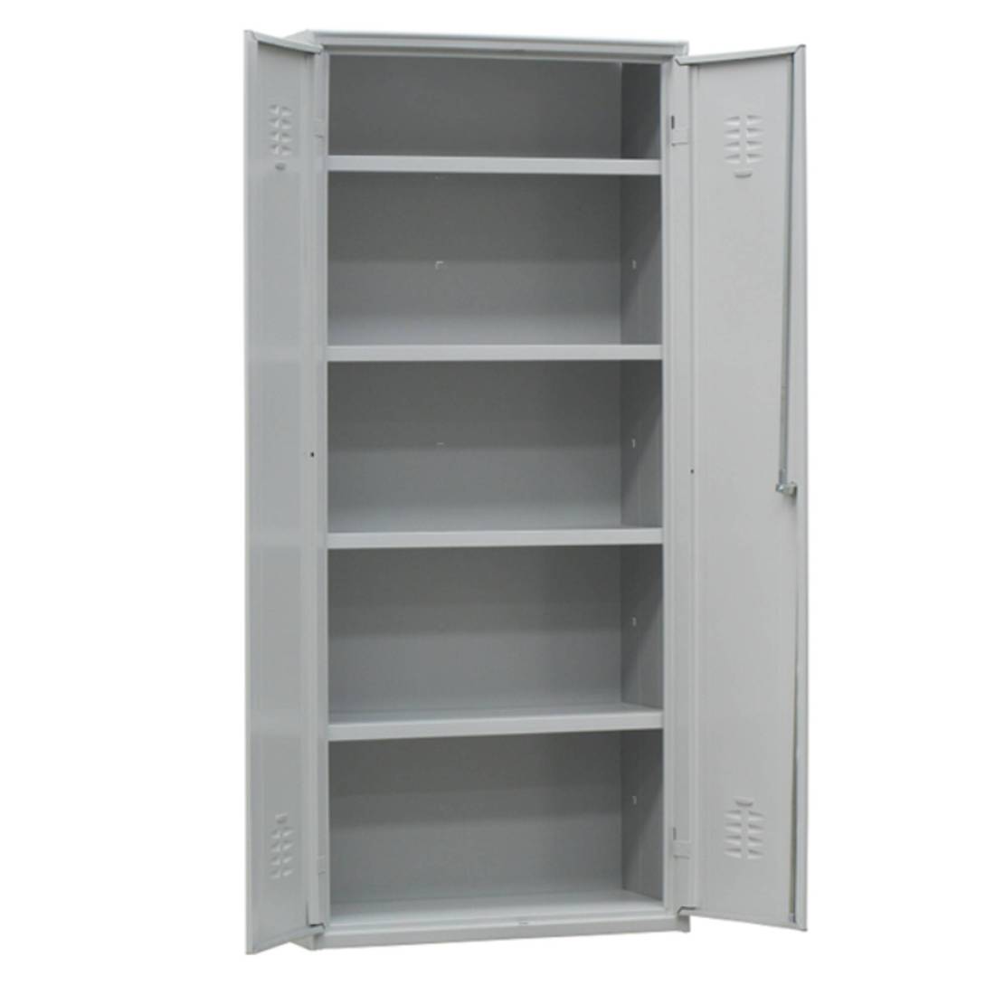 Armadio multiuso a 2 ante battenti con struttura in lamiera d’acciaio profilata di prima scelta. Costituito da 1 vano da 4 ripiani interni rettangolari regolabili su asole in 8 posizioni differenti. Porta cartellino in materiale plastico applicato all’anta. Chiusura con serratura a cilindro con doppia chiave in dotazione. Fornito montato.