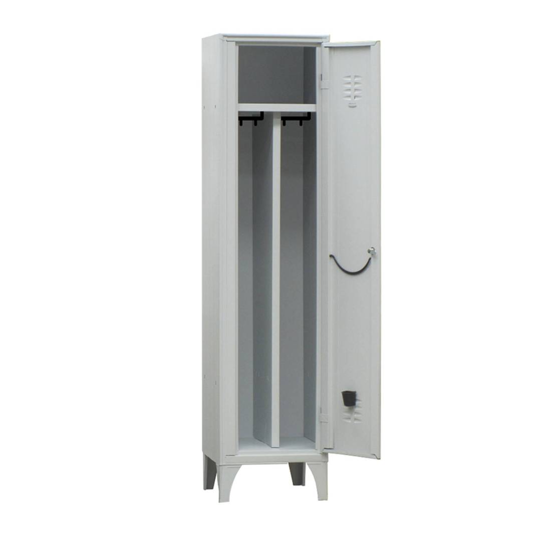 Armadio ad 1 vano con tramezza (per separazione sporco/pulito) dotato di ripiano superiore con sottostante tubo ovale porta grucce in PVC completo di ganci scorrevoli. Tramezza sporco / pulito. Porta ombrello e vaschetta raccogli gocce su anta. Porta cartellino in materiale plastico applicato all’anta. Chiusura con serratura a cilindro con doppia chiave in dotazione. Fornito montato.