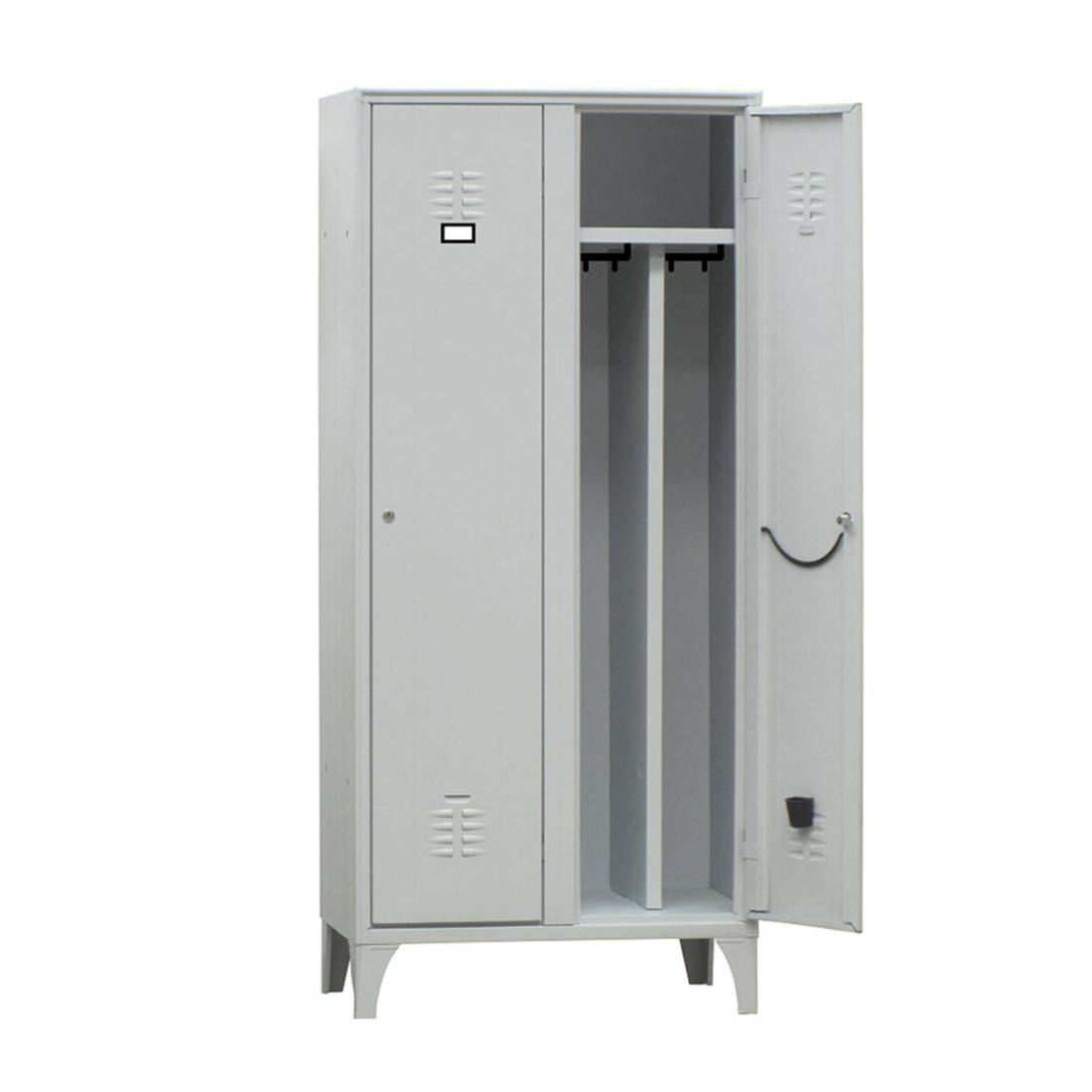 Armadio ad 2 vani con tramezza (per separazione sporco/pulito). Ogni vano è dotato di ripiano superiore con sottostante tubo ovale porta grucce in PVC completo di ganci scorrevoli. Tramezza sporco / pulito. Porta ombrello e vaschetta raccogli gocce su anta. Porta cartellino in materiale plastico applicato all’anta. Chiusura con serratura a cilindro con doppia chiave in dotazione. Fornito montato.