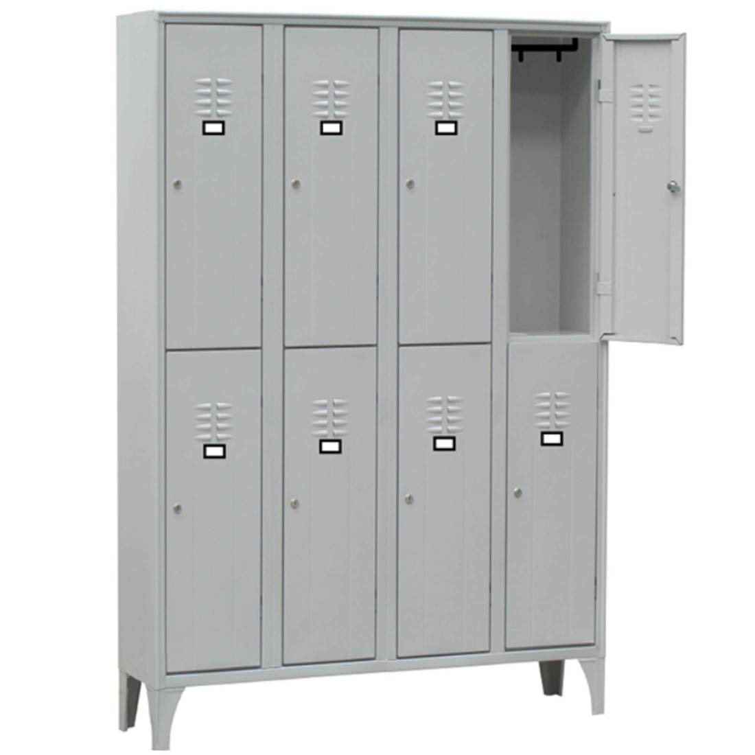 Armadio a 8 vani sovrapposti. Ogni vano è dotato di tubo ovale porta grucce in PVC completo di ganci scorrevoli non estraibili. Porta cartellino in materiale plastico applicato all’anta. Chiusura con serratura a cilindro con doppia chiave in dotazione. Fornito montato. Dimensioni: L120 x P50 x H180cm - peso 57kg Colore di serie corpo: Grigio RAL 7035 Colore di serie ante: Grigio RAL 7035 MADE IN ITALY