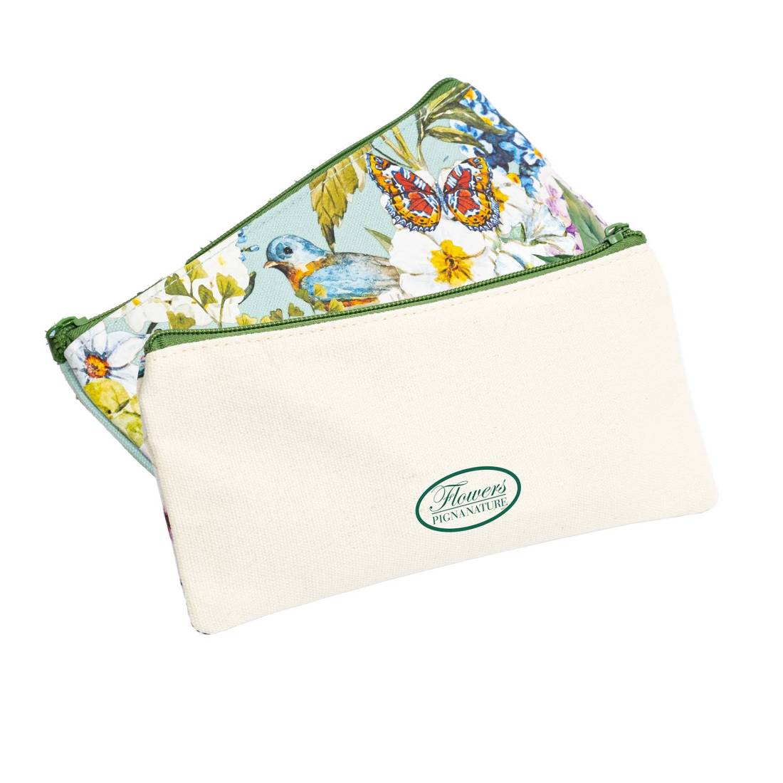 Bustina in tessuto di cotone dotata di zip in tinta personalizzata. Fornita in 4 fantasie assortite.