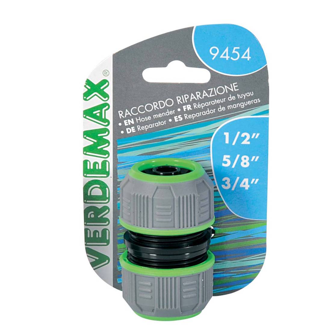 VerdemaxRaccordo riparazionei per l’utilizzo con tre misure di tubi: Ø 1/2” - 5/8” - 3/4” . Un morbido rivestimento in gomma avvolge i raccordi, per una perfetta aderenza con le dita. Resistenti agli urti, ai raggi U.V., alle condizioni atmosferiche.