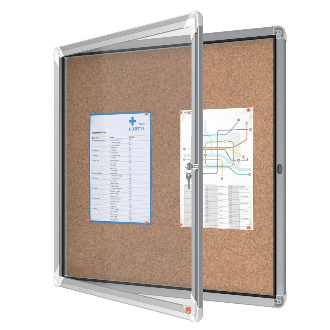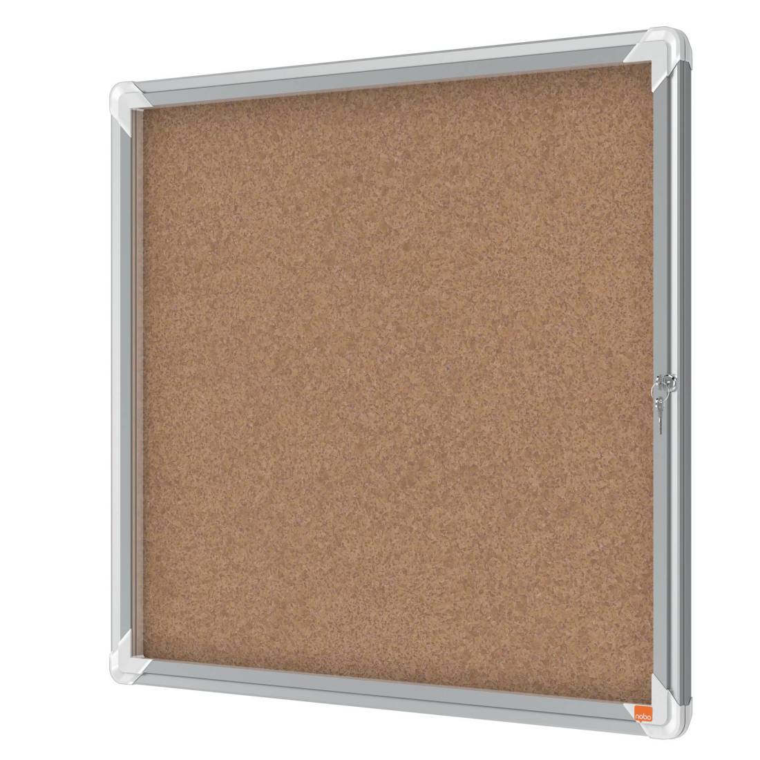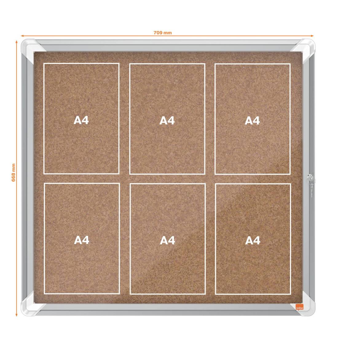 NOBOAd anta battente. Nuovo design con robusta cornice in alluminio e vetro di sicurezza di 4mm. fondo fondo in sughero per uso con puntine. Fissaggio semplice effettuabile da una sola persona. Serratura con 2 chiavi. Apertura istallabile sia a destra che a sinistra. f.to 6xa4. DImensioni: 70,8x66,7x4,3cm