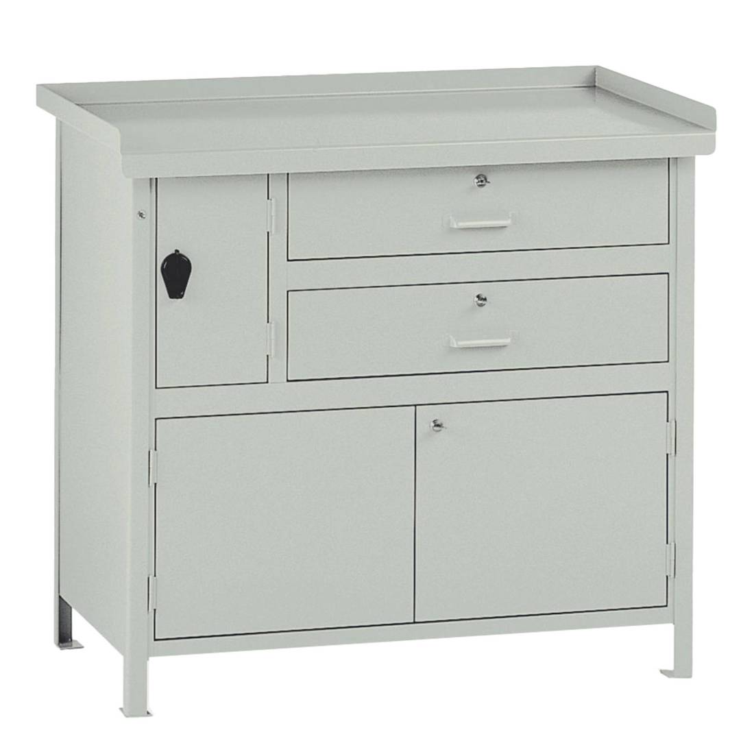 Banco da lavoro in lamiera con piano spessore 25/10, 2 cassetti scorrevoli su guide con cuscinetti a sfera e serratura, 1 vano laterale con nasello in plastica lucchettabile ed 1 vano inferiore con sportelli. Verniciatura a polvere grigio RAL 7038. Dimensioni: 100Lx67Px90Hcm. Portata 1200kg (intesa per carichi uniformemente distribuiti). Fornito montato.