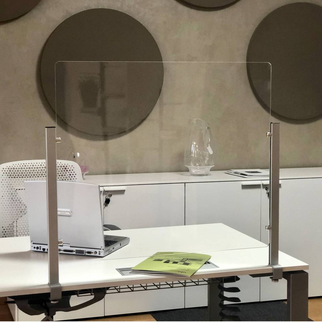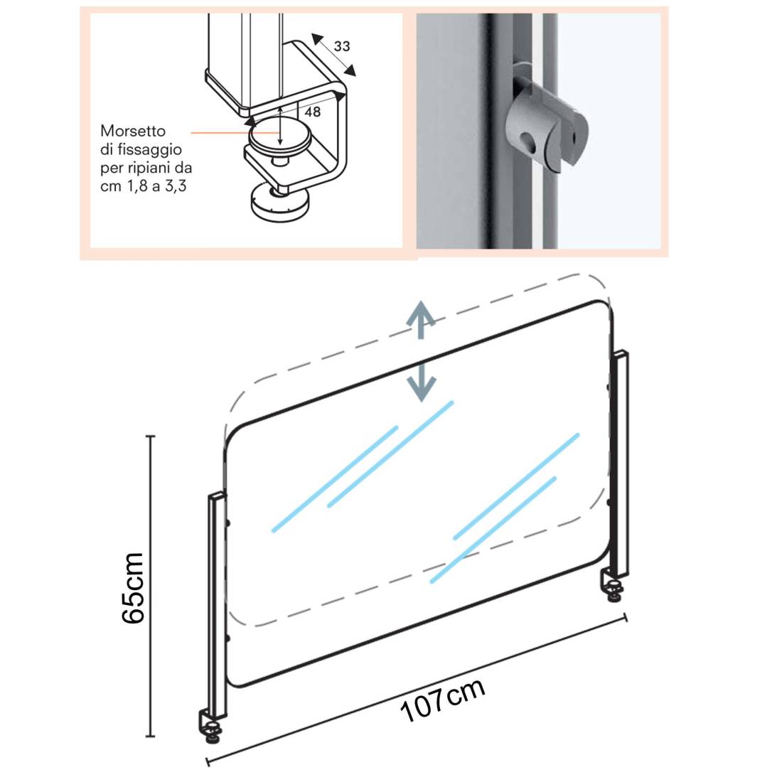 STUDIO TSchermo di protezione realizzato con montanti in alluminio estruso anodizzato silver. Il pannello dello schermo è in metacrilato L100xH59,8cm spessore 5mm sagomato con filo lucido, sorretto da morsetti laterali in alluminio; può essere posizionato liberamente in altezza in modo da lasciare sotto uno spazio passacarte. Lo schermo si fissa alla scrivania tramite morsetti idonei per ripiani di spessore 1,8-3,3cm.