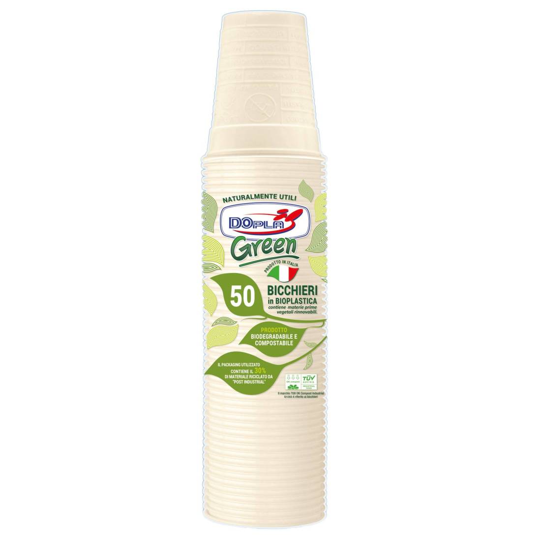 DOPLABicchieri color avorio realizzati in Mater-Bi compostabile. Non Idonei per essere usati in forno ne' nel microonde. Idonei al contatto con gli alimenti. Per alimenti Max 70°C.