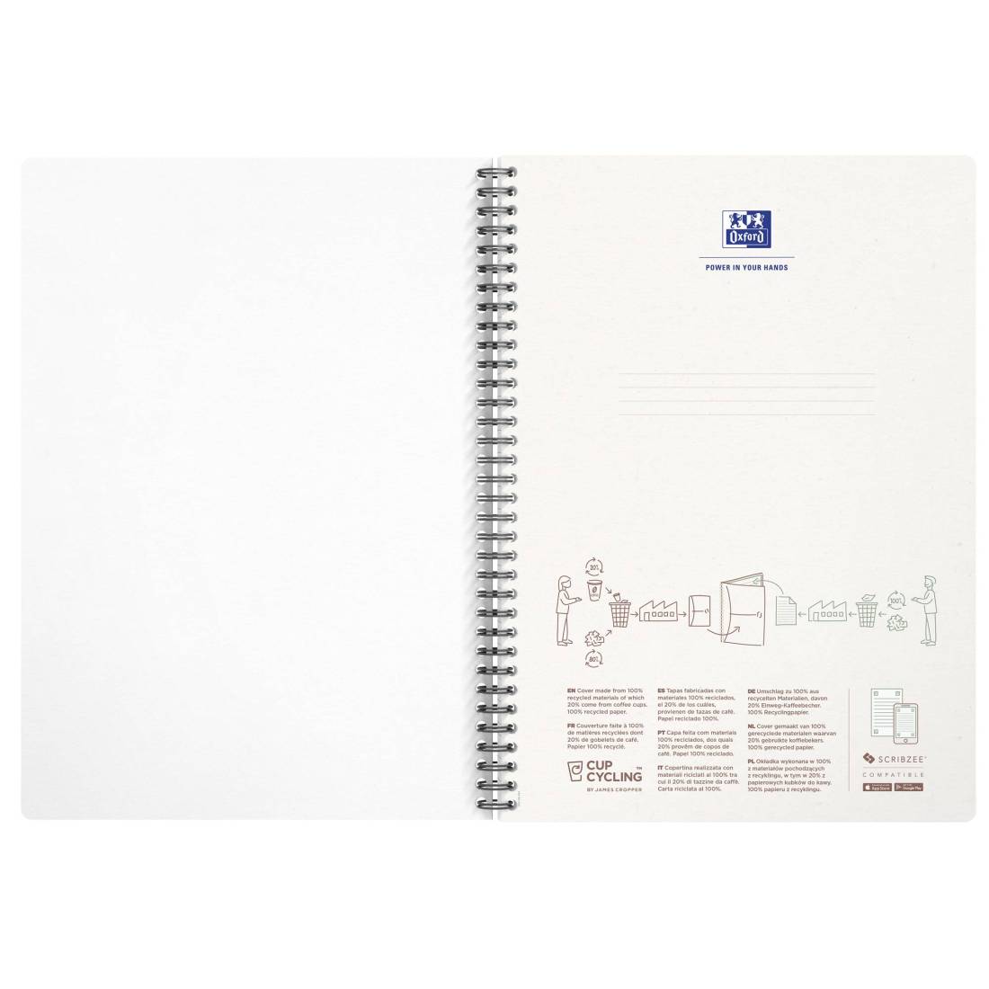 Maxiquaderni spiralati con copertina in colori naturali realizzata con carta riciclata al 100% contenente fibre riciclate da bicchieri di carta usati. 180 pagine di carta da 90g bianca 100% riciclata e liscia per una esperienza di scrittura confortevole senza che l'inchiostro attraversi la pagina. Spirale doppia di colore grigio. Rigature funzionali con margine e intestazione per prendere appunti in modo organizzato. Speciali marcatori agli angoli delle pagine da utilizzare con l'App SCRIBZEE®. La gamma My Rec'up ha ricevuto la certificazione PEFC Recycled Ecolabel.