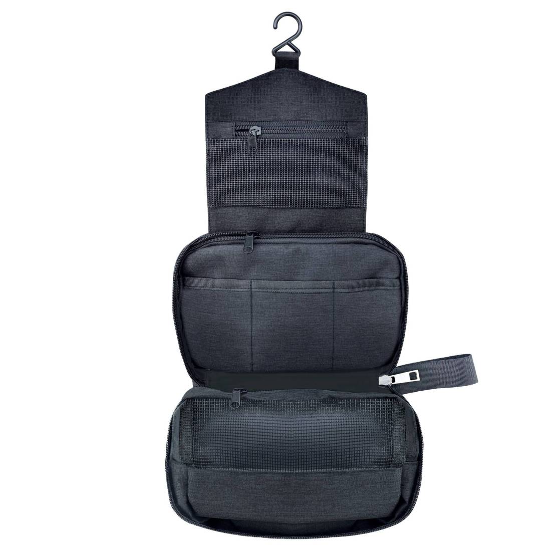 Beauty case da viaggio appendibile, dotato di 3 scomparti con chiusura a zip. 3 tasche frontali. Realizzato in tessuto imbottito resistente adatto garantendo una maggiore protezione degli oggetti.