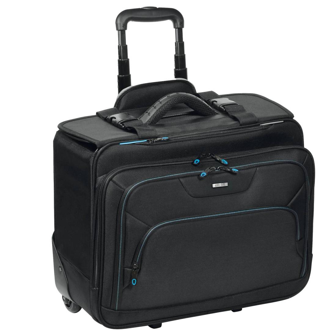 City TimeTrolley in tessuto tecnico. Grande scomparto centrale con imbottitura porta notebook. Quattro tasche frontali con cerniera e tasche porta oggetti. Maniglia imbottita super comfort. Cinghie di fissaggio. Manico telescopico a scomparsa. Targhetta portanome. Dimensioni: 46x40x26cm.
