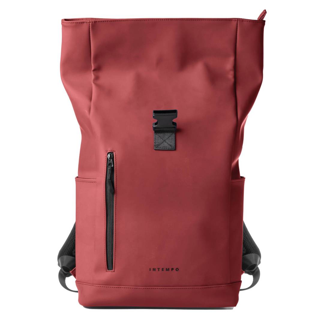 Zaino roll-top in gomma antipioggia, tasca frontale portachiavi e accessori. Grande vano centrale con all’interno guscio estraibile per notebook 15”. Doppia tasca laterale per borraccia e ombrello, schienale e tracolle imbotite, maniglia per il trasporto.