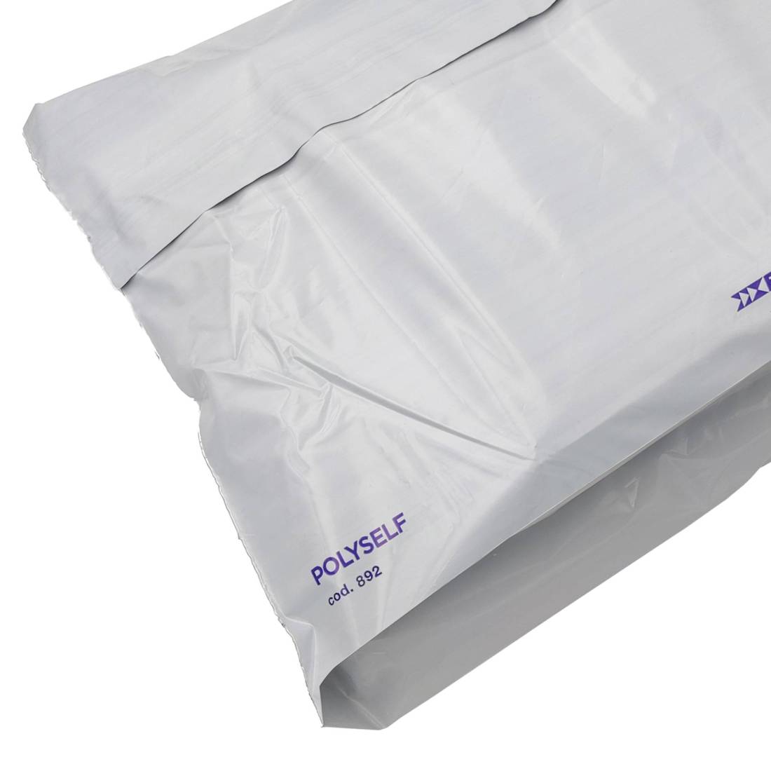 Sacco in polietilene riciclabile da 65 micron. Colore esterno bianco/interno grigio. Termosaldato su due lati. Lembo autoadesivo protetto da Strip Forte. Apertura lato lungo. Sacchetti ideali per i trasportatori e i corrieri.