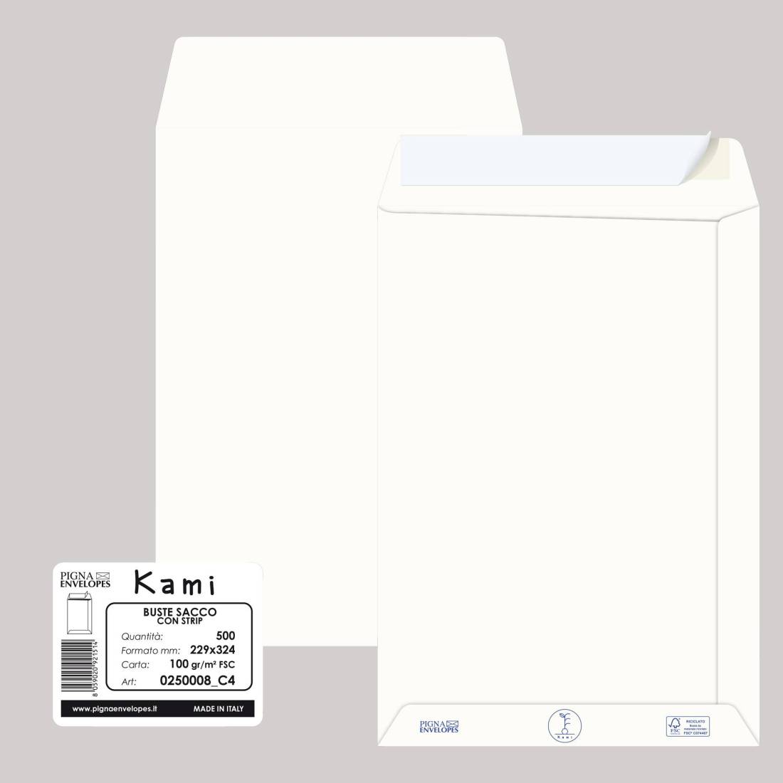 Busta a sacco Kami Strip - 22,9 x 32,4 cm cm - 100 gr - carta riciclata FSC - bianco - Pigna Envelopes - conf. 500 pezzi