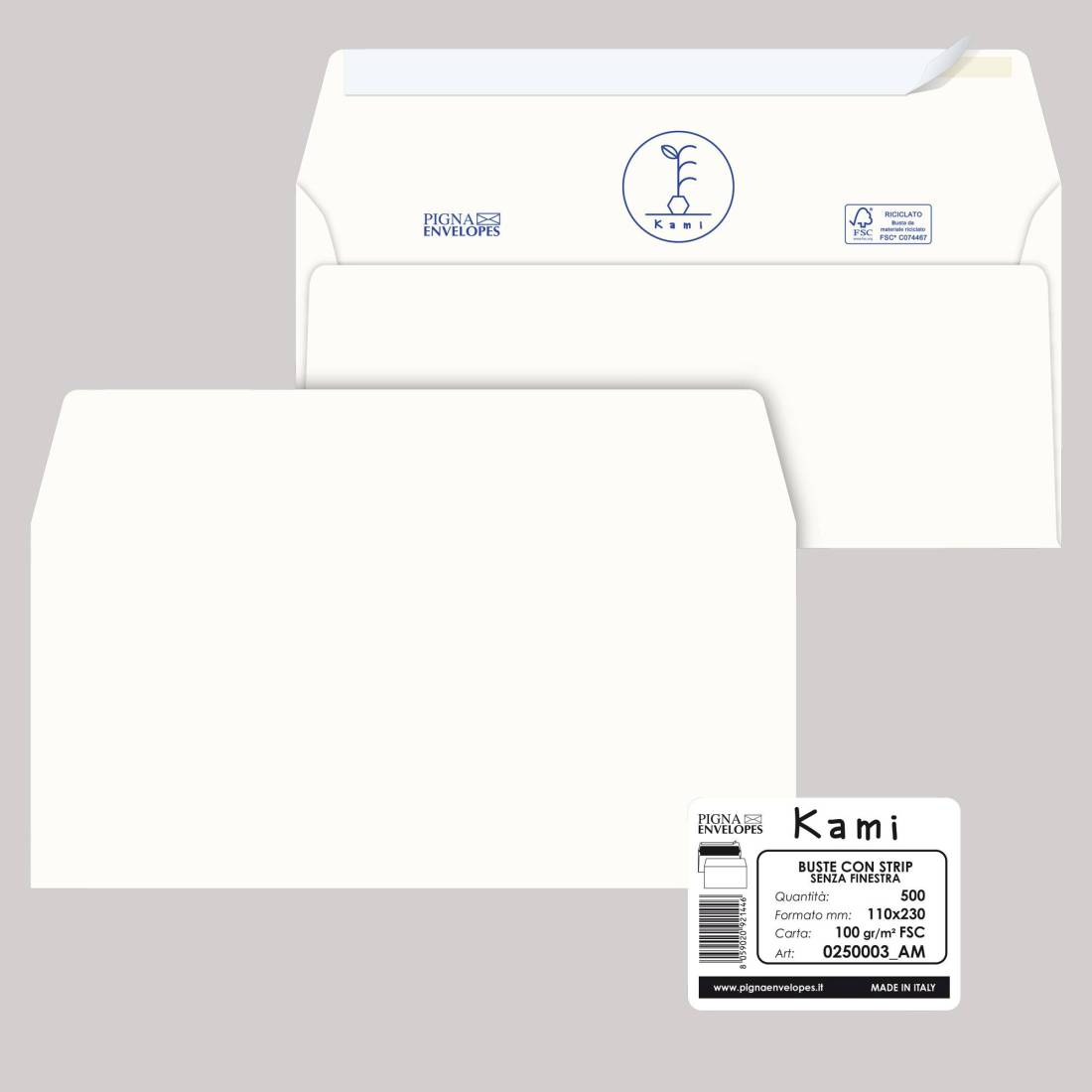 Busta a sacco Kami Strip - senza finestra - 11 x 23 cm - 100 gr - carta riciclata FSC - bianco - Pigna Envelopes - conf. 500 pez