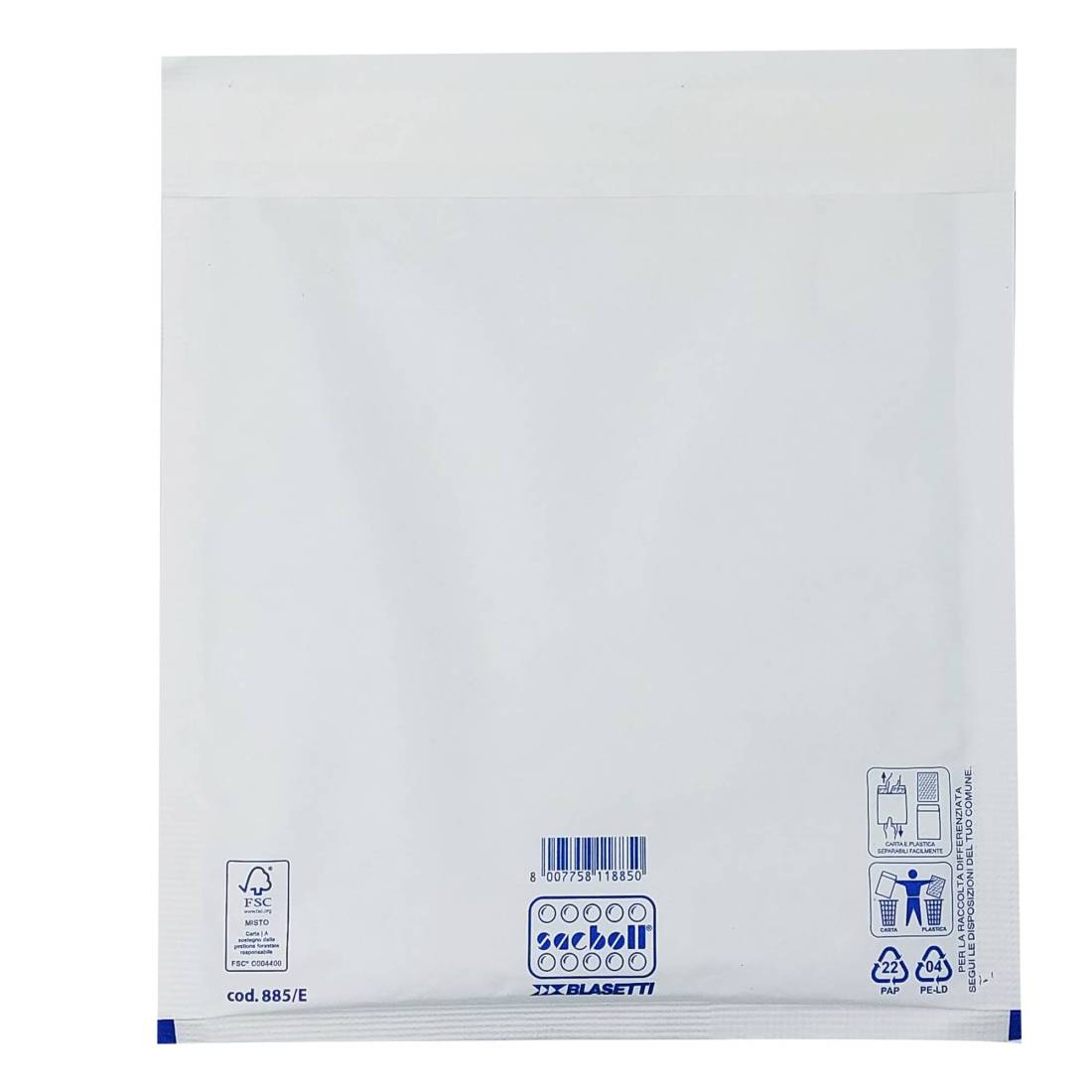 Sacco in carta bianca certificata FSC imbottito con pluriboll. Polietilene a bolle. Termosaldato su tre lati.Lembo autoadesivo protetto da Strip Dati tecnici: Modello: E Formato: 24X32cm Formato interno : 21X26cm Cartone certificato FSC