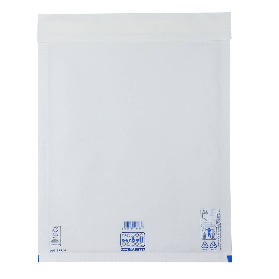 Sacco in carta bianca certificata FSC imbottito con pluriboll. Polietilene a bolle. Termosaldato su tre lati.Lembo autoadesivo protetto da Strip Dati tecnici: Modello: H Formato: 29X42cm Formato interno : 26X36cm Cartone certificato FSC