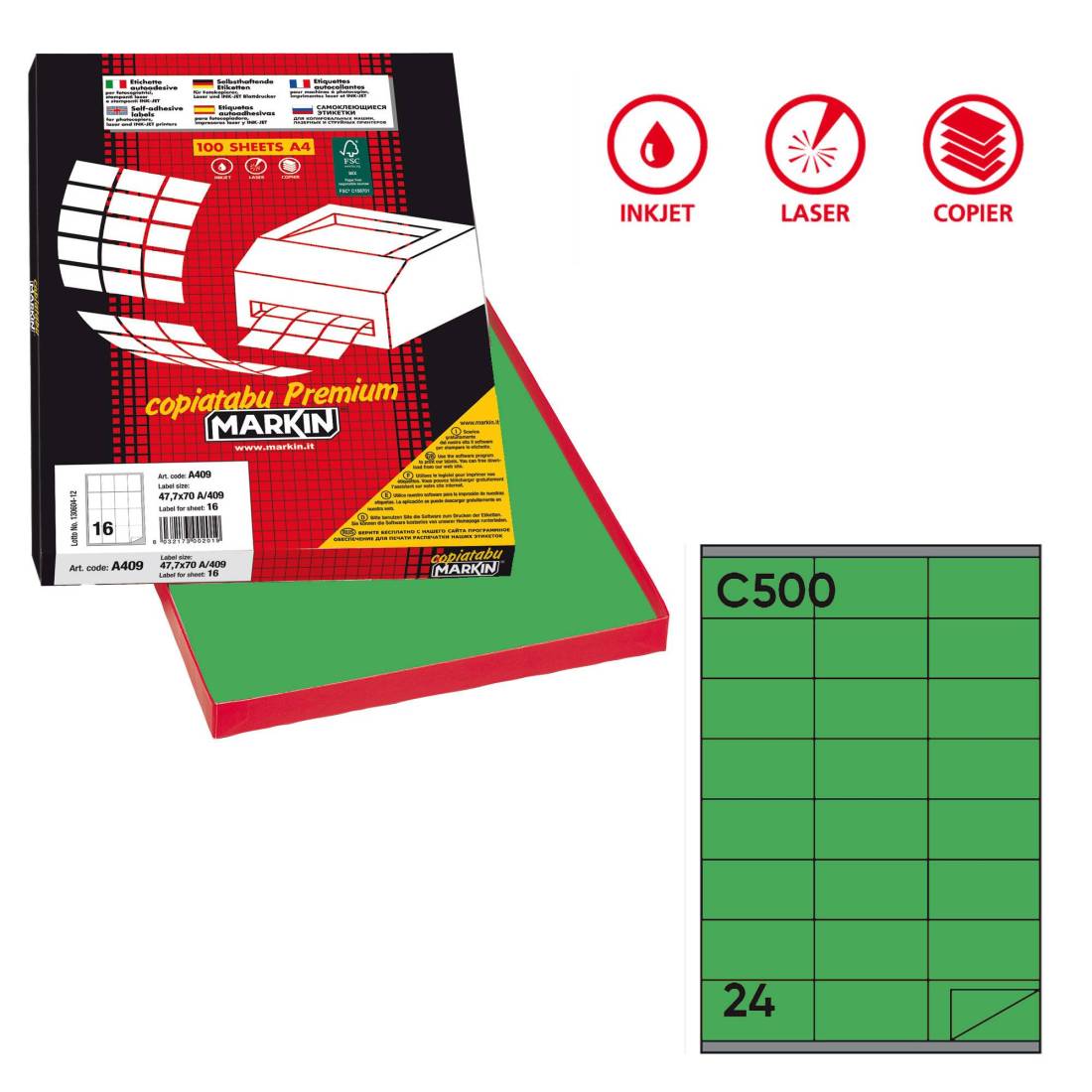Etichette adesive C/500 - in carta - permanenti - 70 x 36 mm - 24 et/fg - 100 fogli - verde - Markin