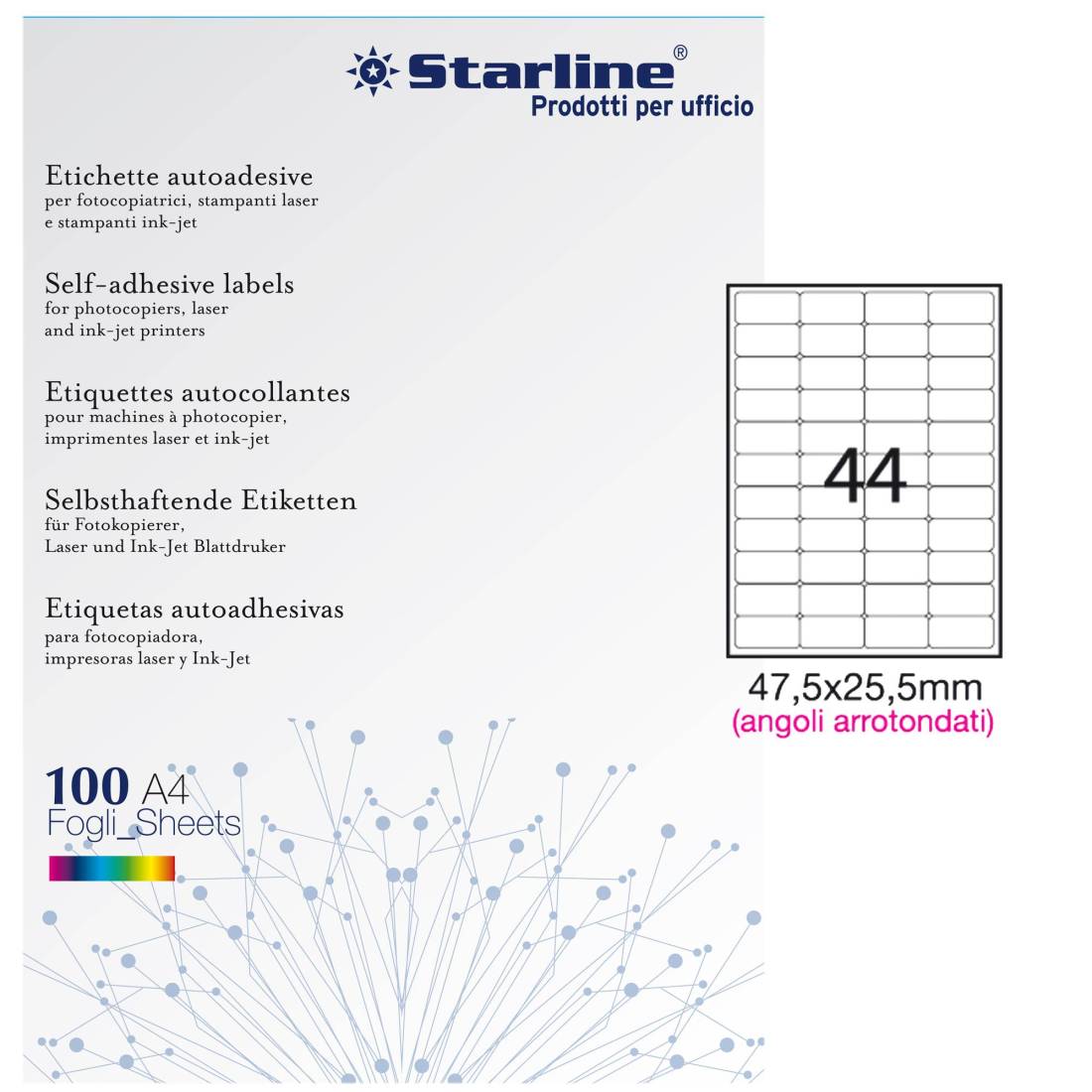 Etichette adesive - in carta - angoli arrotondati - permanenti - 47,5 x 25,5 mm - 44 et/fg - 100 fogli - bianco - Starline