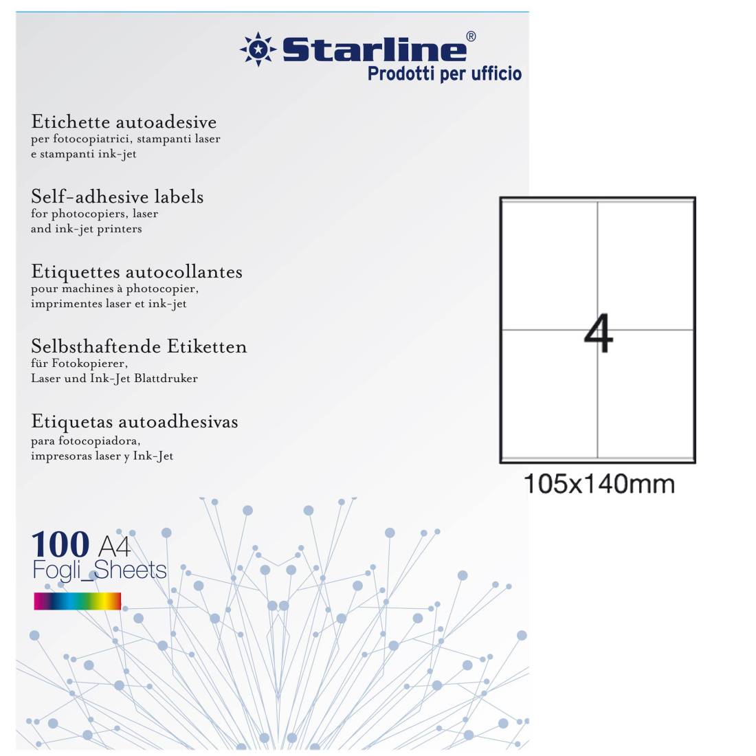 Etichette adesive bianche STARLINE utilizzabili con stampanti laser, inkjet o fotocopiatori. Adesivo permanente. Prive di margne di sicurezza lungo il perimetro. In scatola da 100 fogli formato A4. Caratteristiche di questo articolo: • Codice: STL3036 • Colore: bianco • Adesivo: permanente • Angoli etichette: vivi a 90° • Dimensione etichetta: 105x140mm • Nr. etichette per foglio: 4 • Nr. etichette per scatola: 400 • Stampa: laser, inkjet, copia