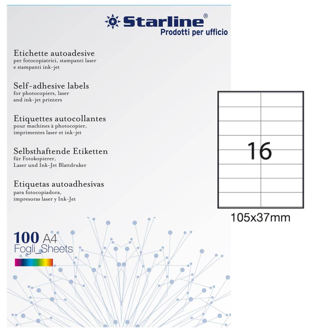 Etichette adesive bianche STARLINE utilizzabili con stampanti laser, inkjet o fotocopiatori. Adesivo permanente. Prive di margne di sicurezza lungo il perimetro. In scatola da 100 fogli formato A4. Caratteristiche di questo articolo: • Codice: STL3028 • Colore: bianco • Adesivo: permanente • Angoli etichette: vivi a 90° • Dimensione etichetta: 105x37mm • Nr. etichette per foglio: 16 • Nr. etichette per scatola: 1600 • Stampa: laser, inkjet, copia