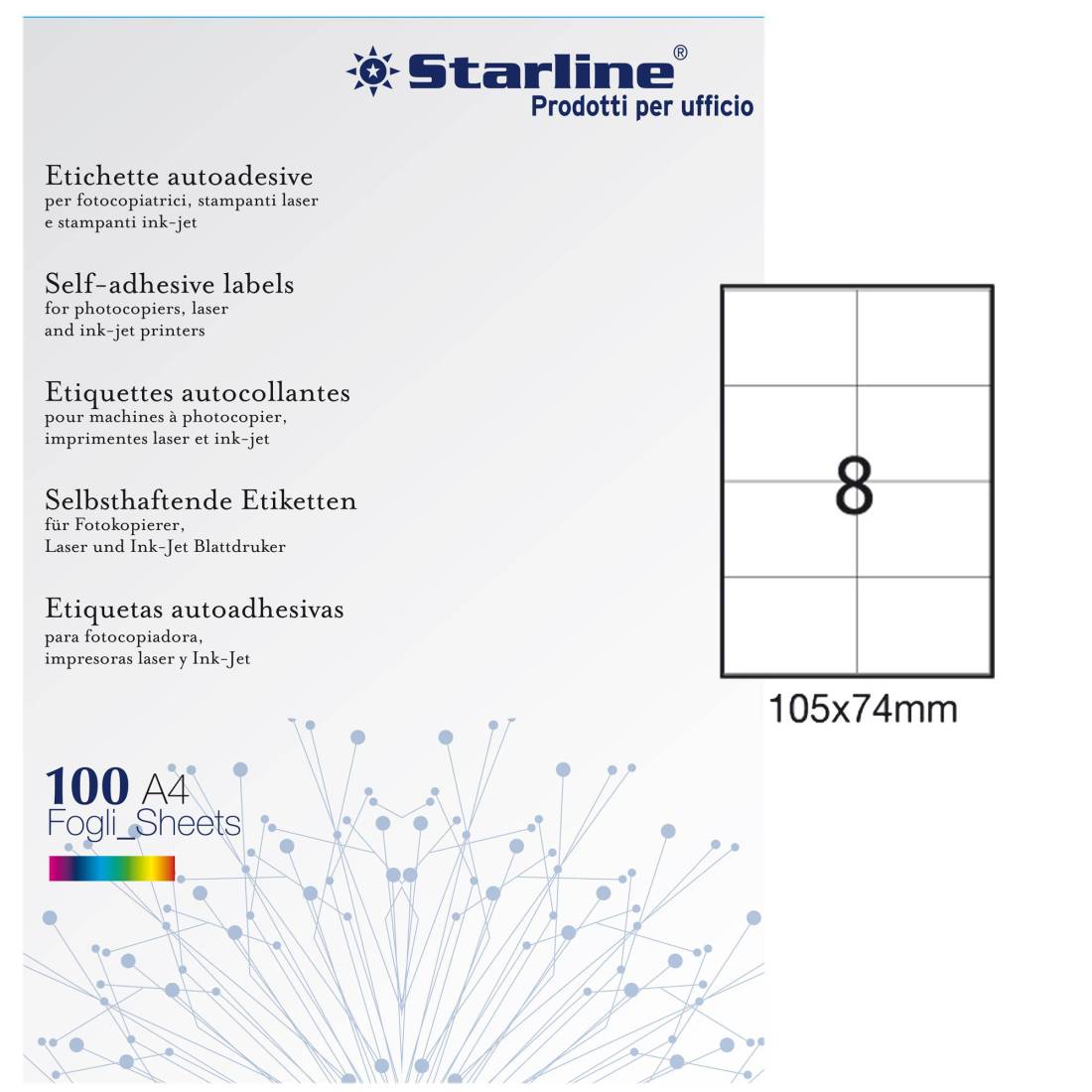 Etichette adesive bianche STARLINE utilizzabili con stampanti laser, inkjet o fotocopiatori. Adesivo permanente. Prive di margne di sicurezza lungo il perimetro. In scatola da 100 fogli formato A4. Caratteristiche di questo articolo: • Codice: STL3034 • Colore: bianco • Adesivo: permanente • Angoli etichette: vivi a 90° • Dimensione etichetta: 105x74mm • Nr. etichette per foglio: 8 • Nr. etichette per scatola: 800 • Stampa: laser, inkjet, copia