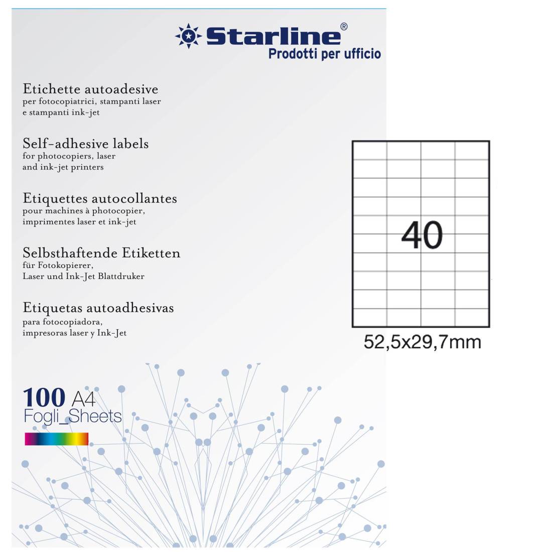 Etichette adesive bianche STARLINE utilizzabili con stampanti laser, inkjet o fotocopiatori. Adesivo permanente. Prive di margne di sicurezza lungo il perimetro. In scatola da 100 fogli formato A4. Caratteristiche di questo articolo: • Codice: STL3019 • Colore: bianco • Adesivo: permanente • Angoli etichette: vivi a 90° • Dimensione etichetta: 52.5x29.7mm • Nr. etichette per foglio: 40 • Nr. etichette per scatola: 4000 • Stampa: laser, inkjet, copia