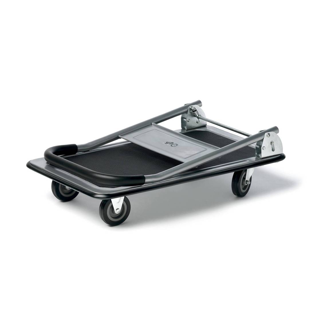 SERENA GROUPCarrello in lamiera rinforzata e maniglia tubolare ripiegabile tramite comando a piede. Piattaforma bordata in gomma e piano di carico rivestito con antiscivolo. Dotato di ruote in gomma piena. Dimensioni: L91 x P61 x H87cm. Portata massima 300kg.