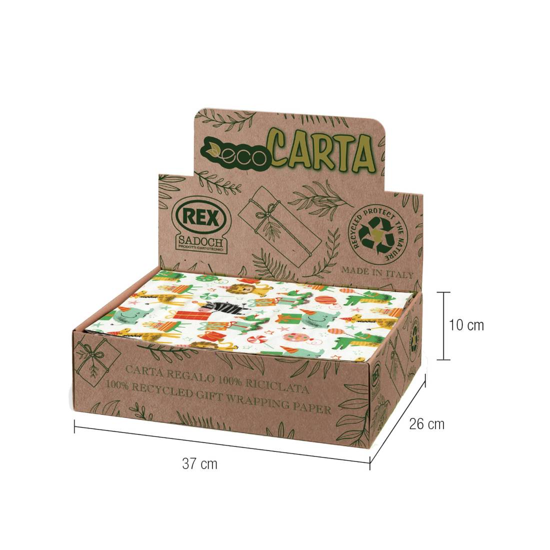 Carta da regalo 65gr/m2 riciclata al 100%. 12 fantasie assortite.