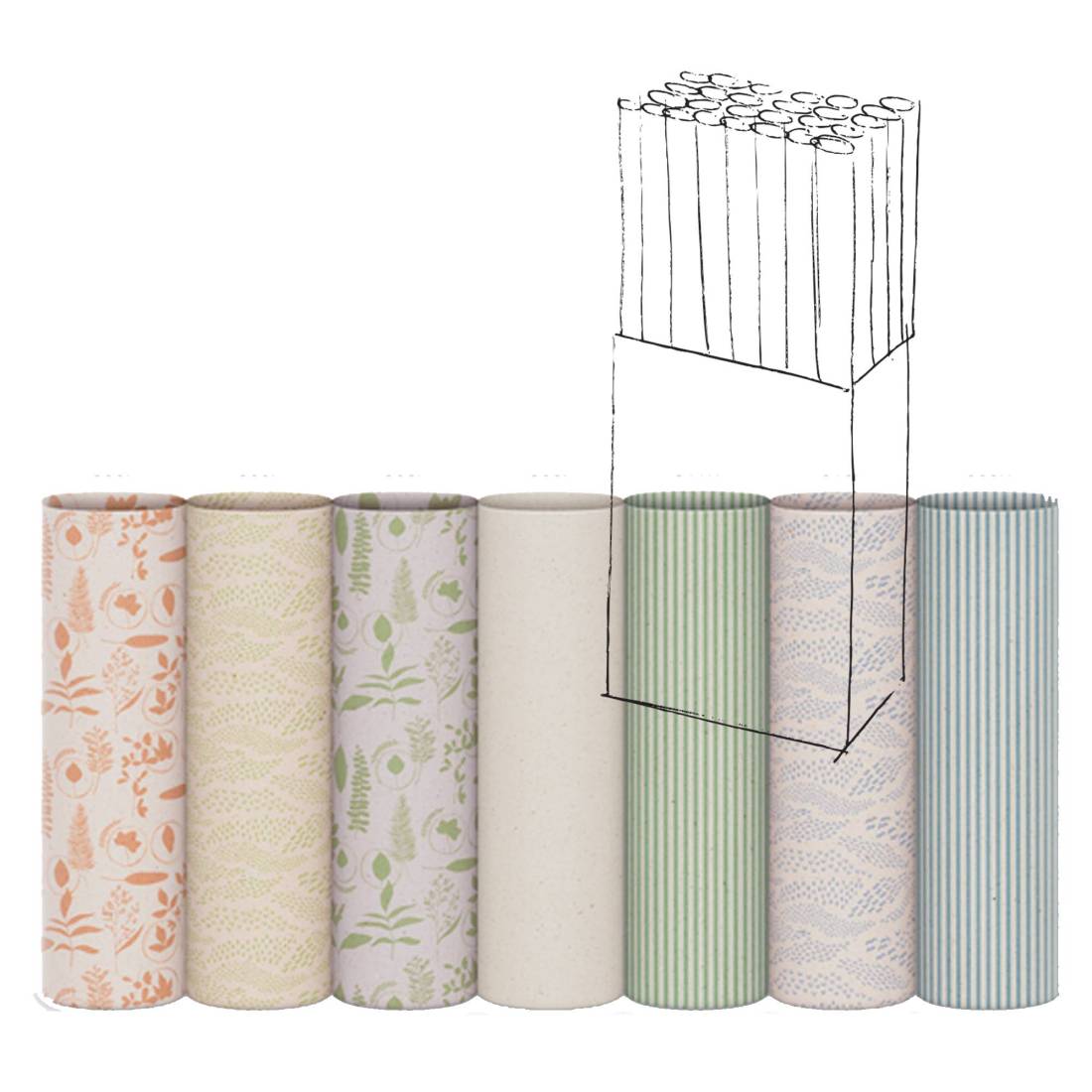 REX SADOCHCarta regalo in rotolo da 70cmx2mt. Carta kraft bianca erba riciclata al 100% 70g/m2. Ottenuta da fibre di erba essicata, leggera profumazione d'erba. Fantasie assortite.