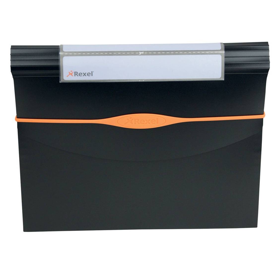 Cartelle a soffietto in robusto polipropilene finitura nera opaca. Internamente 13 scomparti dotati di cavalierino trasparente ed etichette colorate stampabili. Speciale patella di chiusura che consente un facile accesso ai documenti. Capacità fino a 500fg. Formato utile: 22x33cm