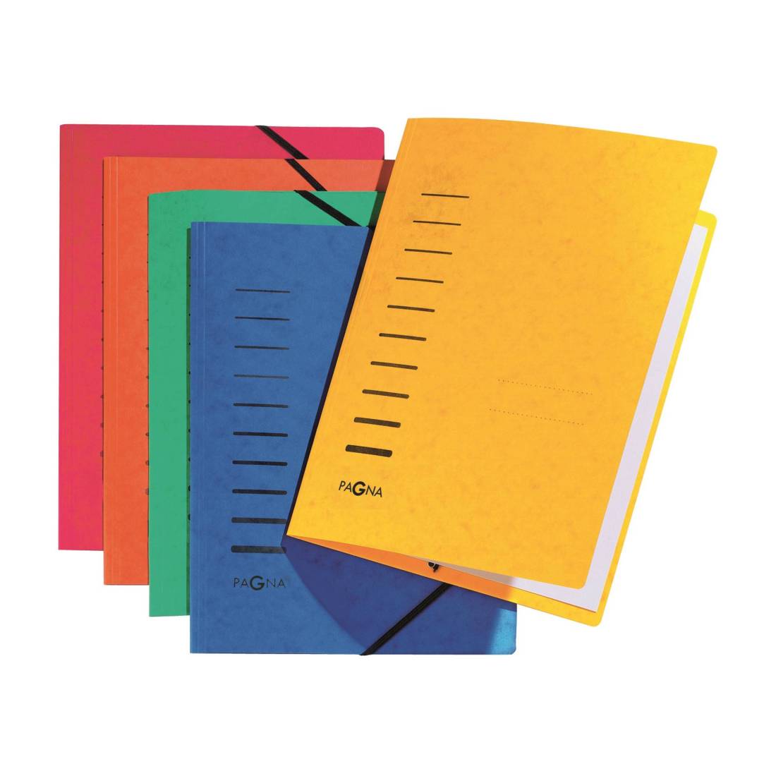PAGNACartellina, per documenti in formato A4, in robusto cartone pressato da 335 gr, con elastico angolare nero per l’archiviazione sicura dei documenti senza fori. Diverse opzioni di piegatura in funzione del volume di fogli, area per marcatura personalizzata.