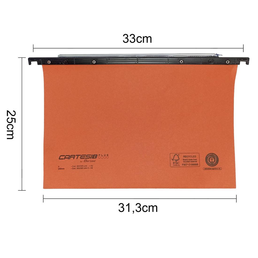 Cartelle sospese Top di gamma e con i massimi requisiti in termini di sostenibilità ambientale (dotate di doppia certificazione ecologica: FSC® e Der Blauer Engel). Fabbricate con i migliori materiali e le migliori tecniche produttive, sono garantite 20 anni. Realizzate in cartoncino Kraft robusto (peso di 240 gr/mq.) ed ecologico (100% riciclato post-consumo). Aste di sospensione in polistirene nero antiurto, molto resistenti (spessore 6 mm.) e rispettose dell'ambiente (90% riciclato post-consumo). Sistema di assemblaggio tramite rivetti metallici che garantisce i massimi requisiti in termini di resistenza e durata. Portaetichette già montato in plastica trasparente con effetto lenticolare (100% riciclato post-industriale) lungo 31 cm. Sistema di collegamento in continuo delle cartelle con bottoni a pressione per prevenire eventuali perdite od errata classificazione dei documenti. Etichette con bordo colorato per l’immediata individuazione dei fascicoli. Interasse 33 cm. fondo a V. Conf. 25 pezzi Colore Arancio Certificazione Prodotto: FSC® Recycled e Der Blauer Engel. Garanzia Prodotto: 20 anni. MADE IN ITALY