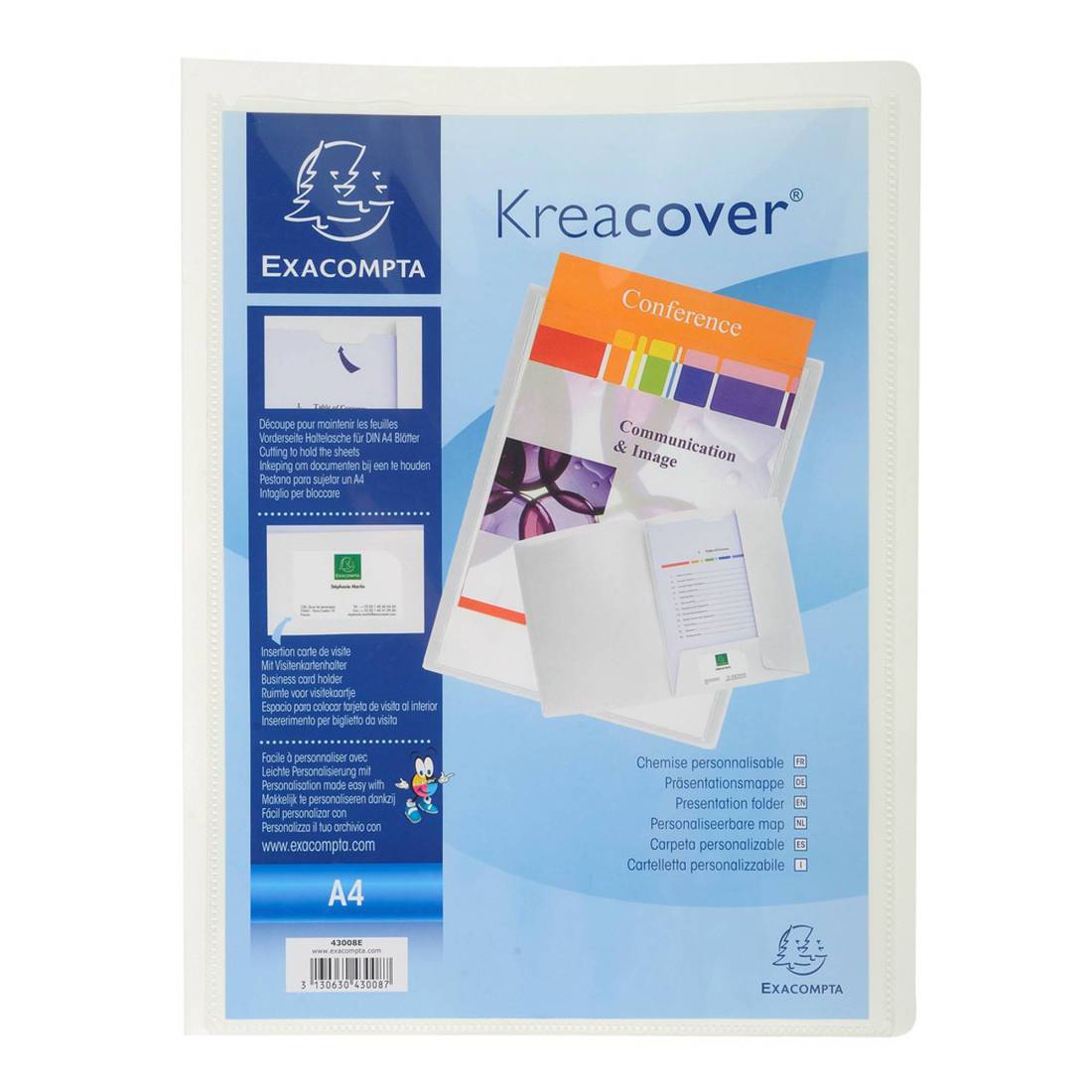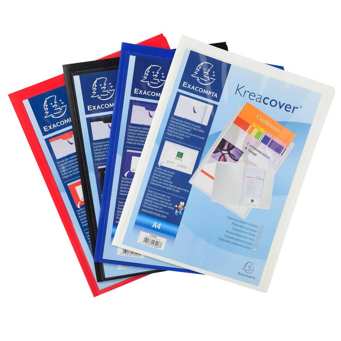 EXACOMPTACopertina morbida con busta A4 trasparente per la personalizzazione. Spazio un biglietto da visita nell'intaglio in basso della cartella. Assortito in 4 colori: Bianco - Blu - Nero - Rosso. F.to esterno 24x32cm.