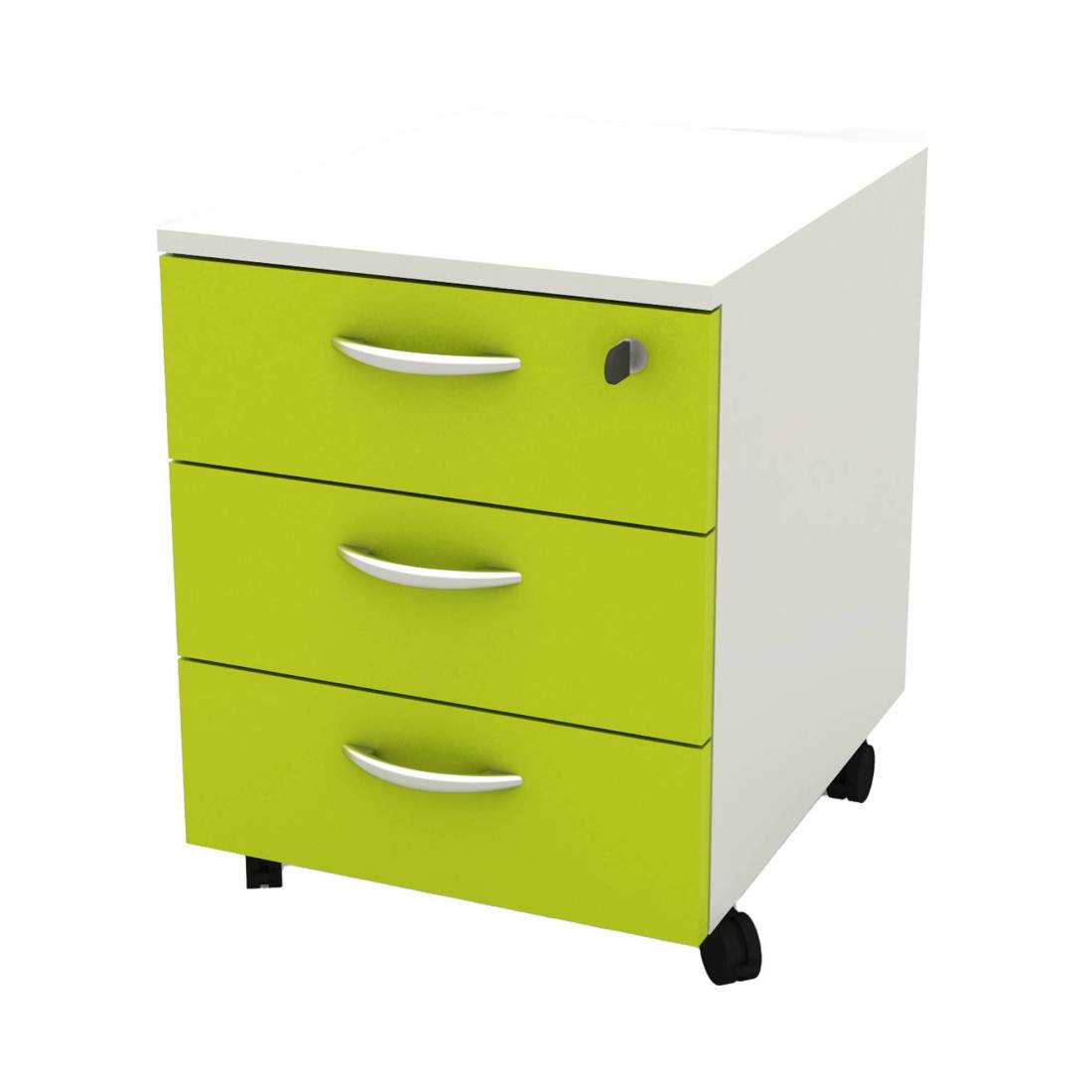 Cassettiera a 3 cassetti su ruote. Serratura sul primo cassetto, guide metalliche. Dimensioni utili dei cassetti: L31,8 x P38,3 x H10,9cm. Dimensione totale: L41 x P50 x H52,2cm. Colore struttura bianca e dei cassetti verde. Fornita in kit DA ASSEMBLARE.