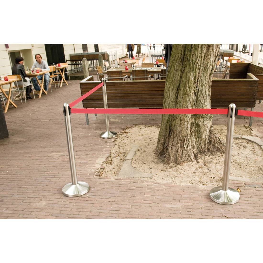 Colonnina in acciaio inox satinato H100cm con nastro in nylon da 210cm. Ogni colonnina ha 4 diversi punti per l'aggancio del nastro retrattile. Adatta sia per uso interno che esterno. Ogni colonnina comprende un attacco extra per fissare il nastro alla parete. Peso: 12Kg.