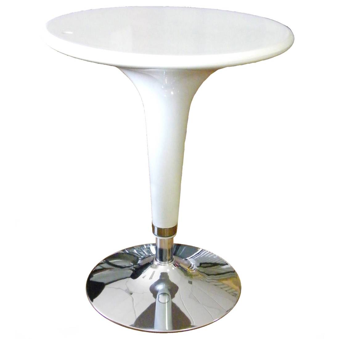 Tavolo in abs provvisto di alzo a gase base in acciaio cromato. Finitura lucida. Dimensioni: diametro cm 60 x h.72 / 92