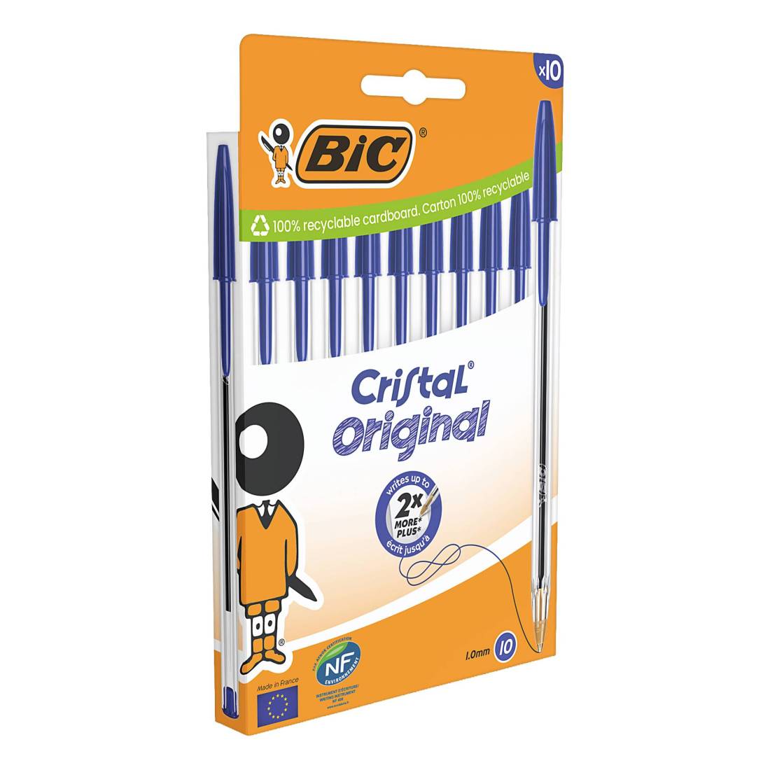 La penna CRISTAL fine con cappuccio e tappino del colore dell'inchiostro, fusto esagonale trasparente o traslucido per il controllo dell'inchiostro. Punta 1,0mm. Colore: blu. Confezione 10 pezzi.