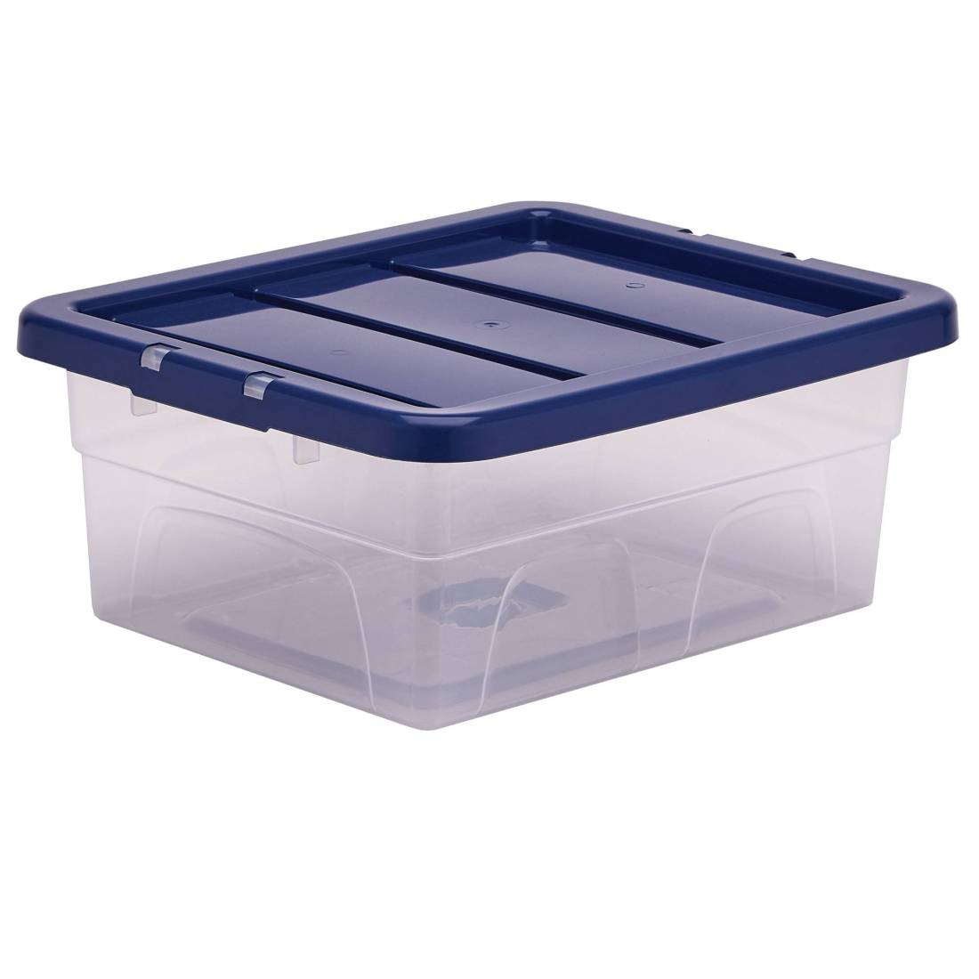 Contenitori multiuso trasparente con coperchio blu, per organizzare il tuo spazio di lavoro o personale. Progettati per annidarsi l'una nell'altra quando sono vuote o per impilarsi quando sono piene. Il coperchio antipolvere, realizzato al 100% con plastica riciclata post-consumo, protegge il contenuto e le chiusure a scatto lo mantengono in posizione. I contenitori sono realizzati in polipropilene 100% privo di BPAe completamente riciclabile.