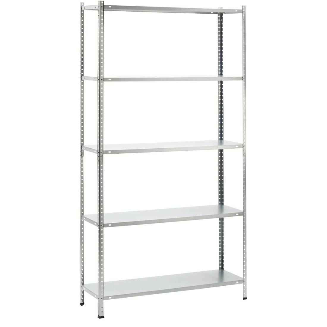 Scaffale in metallo galvanizzato a bulloni con 5 ripiani, spessore 0,5 mm, portata massima 50 kg per ripiano uniformemente distribuiti. Spessore struttura 0,55 mm. Prodotto da assemblare. Dimensioni:H187 x P30 x L100cm. Articolo destinato ad esclusivo uso domestico. Non adatto ad uso pubblico.