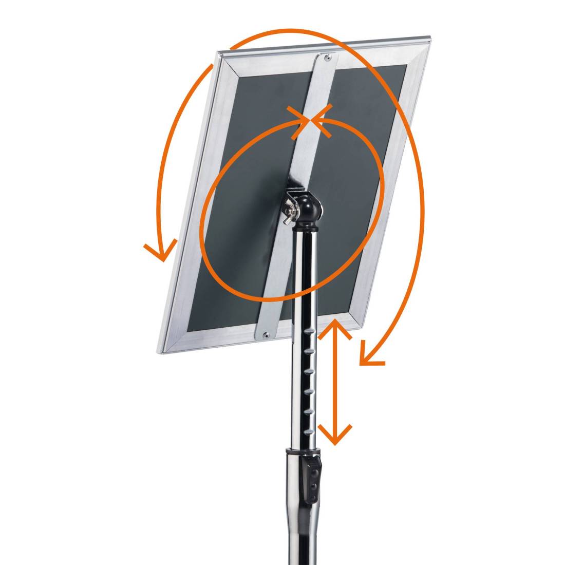 Espositore da pavimento facile da assemblare con robusta cornice a scatto in alluminio anodizzato. Per un'elevata stabilità consigliamo di riempire la base (diametro: 250 mm) con la sabbia. La base rotonda con rivestimento in gomma che previene la formazione di graffi sul pavimento. Altezza regolabile grazie all'asta telescopica (regolabile in step da un'altezza minima di 770cm a un massimo di 120,5cm). La cornice può essere facilmente ruotata dal formato verticale a quello orizzontale. Angolo di lettura regolabile tramite giunto sferico. Foglio di protezione resistente ai raggi UV e antiriflesso. Pannello posteriore in polistirene antiurto.