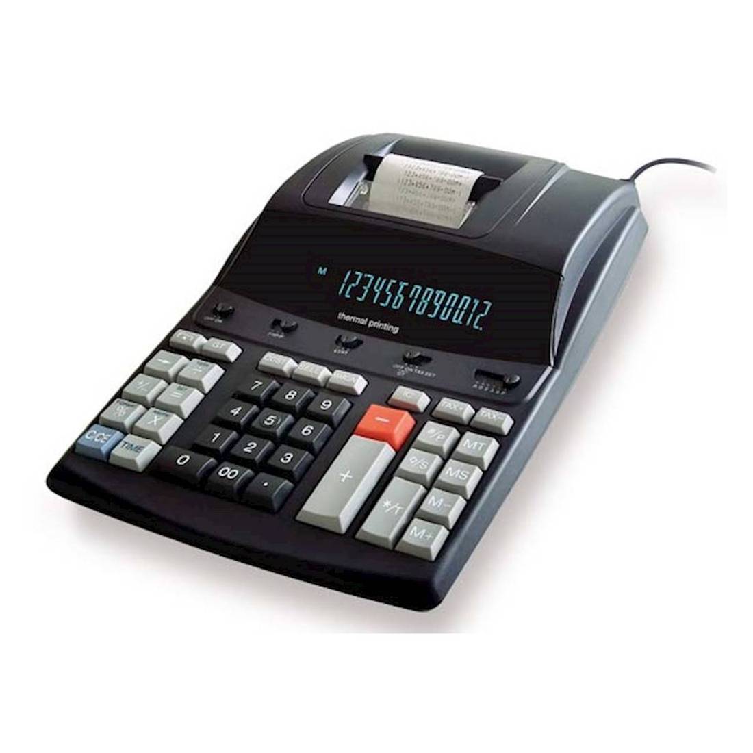 Calcolatrice stampante termica professionale da tavolo - display a 12 cifre - velocità di scrittura: 5 linee al secondo - colore stampa: nero - misura carta: larghezza mm 57, diametro mm 80 - 4 tasti di memoria - tasti funzione: percentuale, correzione, abilita e disabilita la funzione di stampa, 5/4 e CUT selettore dei decimali A, 0, 2, 3, 4, F, modalità Gran Totale, calcolo tassi di interesse, avanzamento carta, sub totale, tasti COST-SELL-MARGIN, tasto modalità orologio e calendario, comando per contatore, tasto per data o numero - certificazioni CE e RoHS - dimensioni: LxPxH mm 323x220x80 - stand by dopo 5 minuti di inutilizzo.