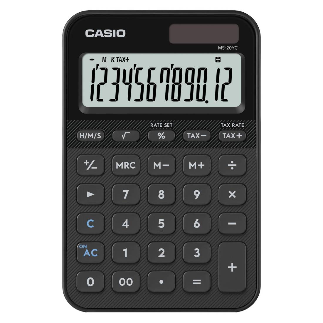 Calcolatrice da tavolo My style compatta ed elegante, display a 12 cifre e alimentazione solare, con nuove varianti di colore e design moderno. Tra le funzioni: calcolo delle imposte, calcolo dell'ora, radice quadrata, calcolo percentuale, 3 tasti memoria, tasto doppio zero.